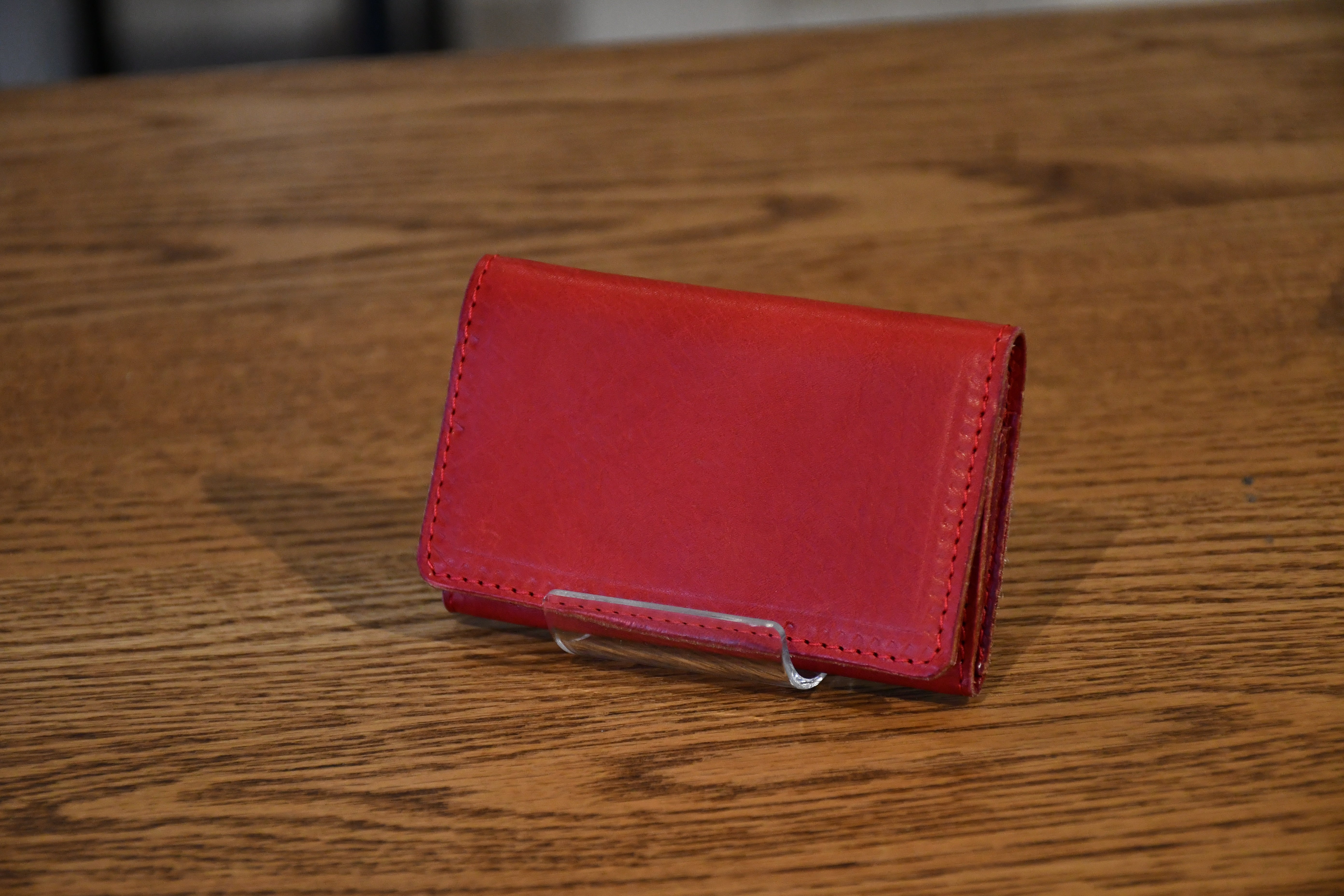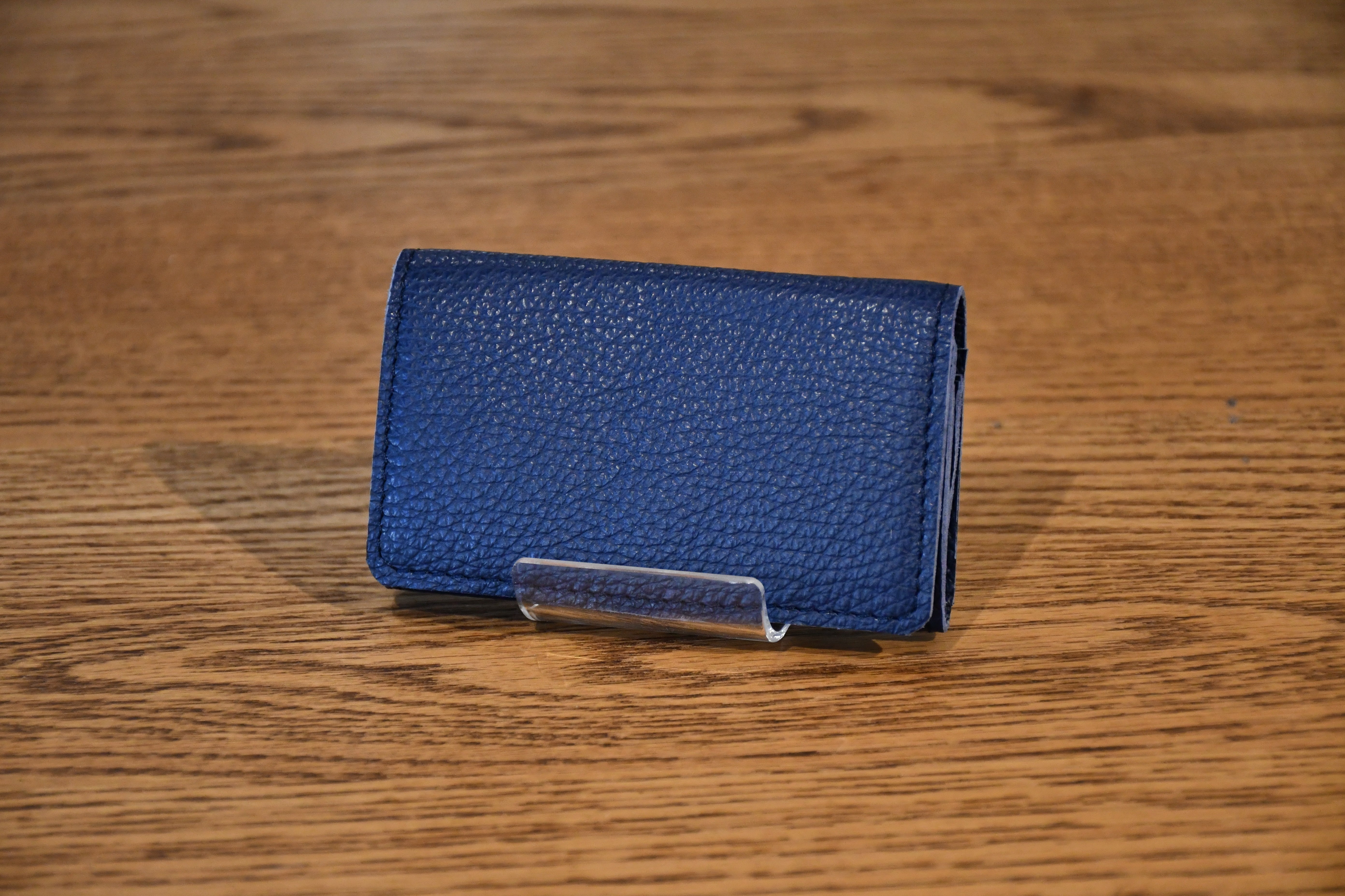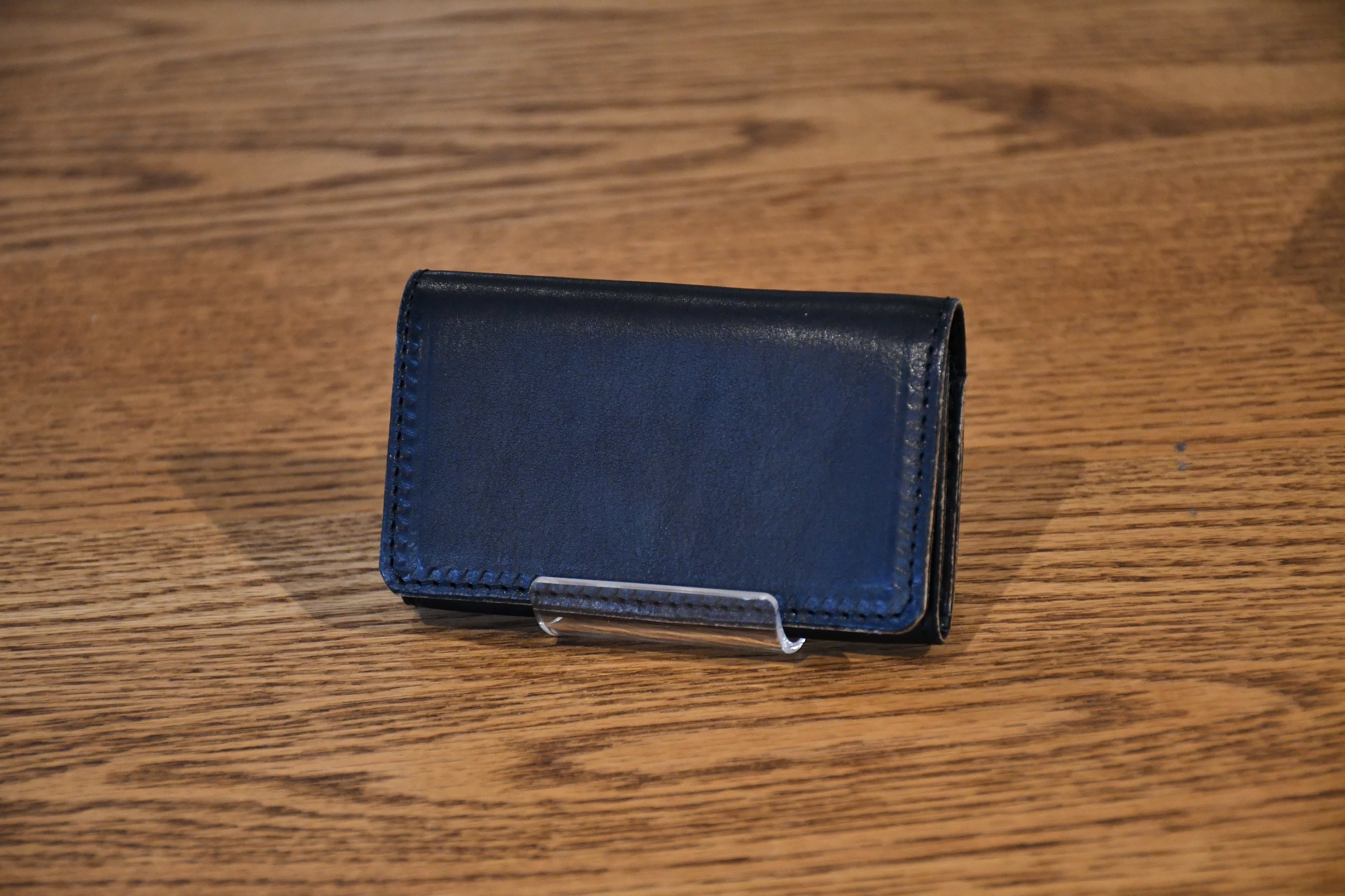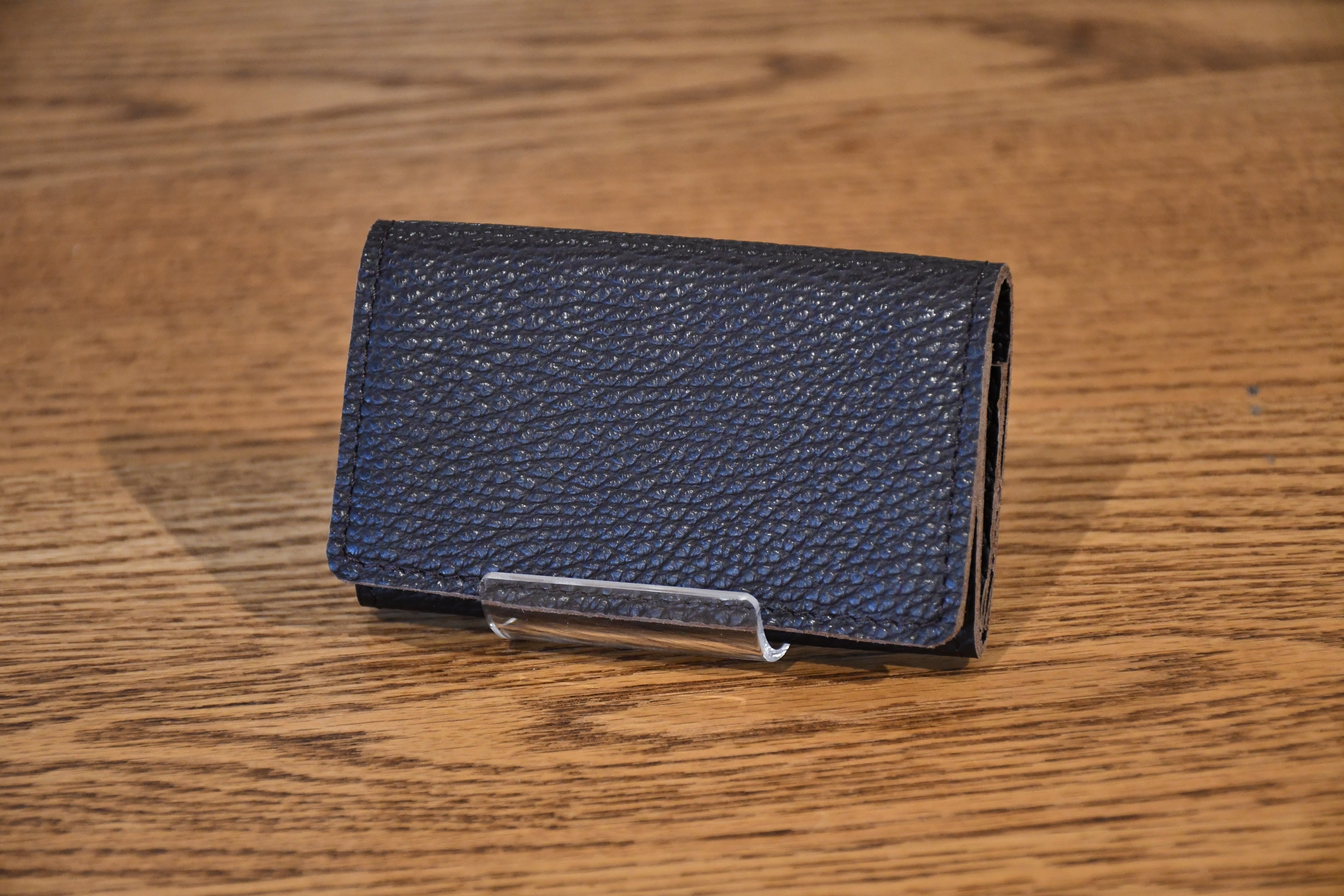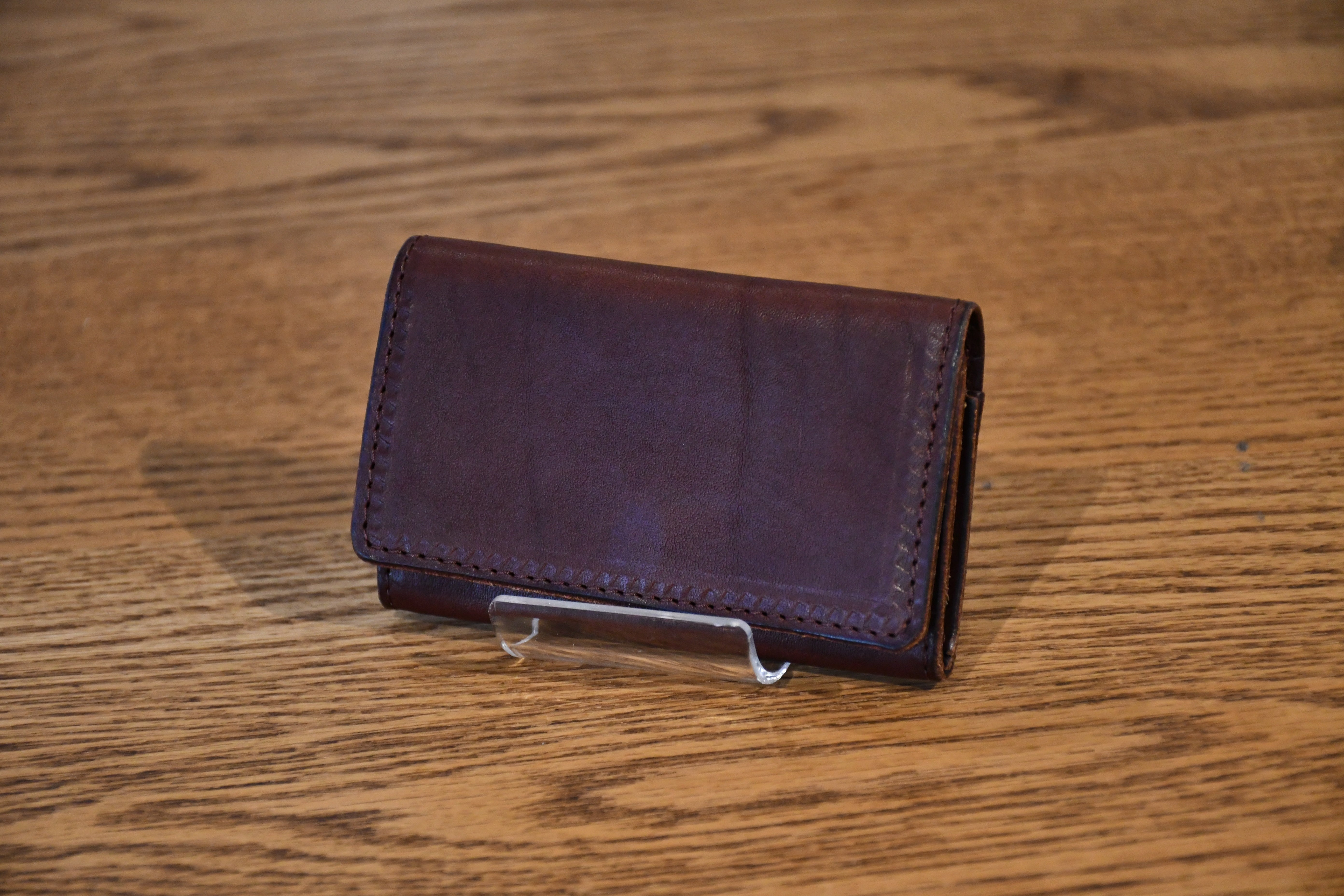 革の厚みはわずか1.1mm。縁の部分には先端0.5mmまで薄くする斜め漉き加工を施し、スマートな仕上がりを実現しています。隠しボタン仕様で、外観を損なわず手触りも快適。小銭入れはマチ付き構造で、視認性と取り出しやすさを両立。ファスナーを使わず、かぶせ仕様で落下を防ぎながら必要な時にすぐ取り出せます。カード入れは蛇腹構造を採用。コンパクトなサイズ感ながら、カードを2~3枚スムーズに出し入れ可能です。収納は3箇所で、小銭18枚〜30枚、カードや名刺、お札もコンパクトに収納可能。ステッチは同色で目立たず、ビジネスシーンでも活躍。機能と美しさの融合厚みは約2cmで、スマートな外観を保ちながら必要十分な収納力を実現。ハンドメイドならではの丁寧な仕上げと、「Nameless★」のレーザー刻印が高級感をさらに引き立てます。