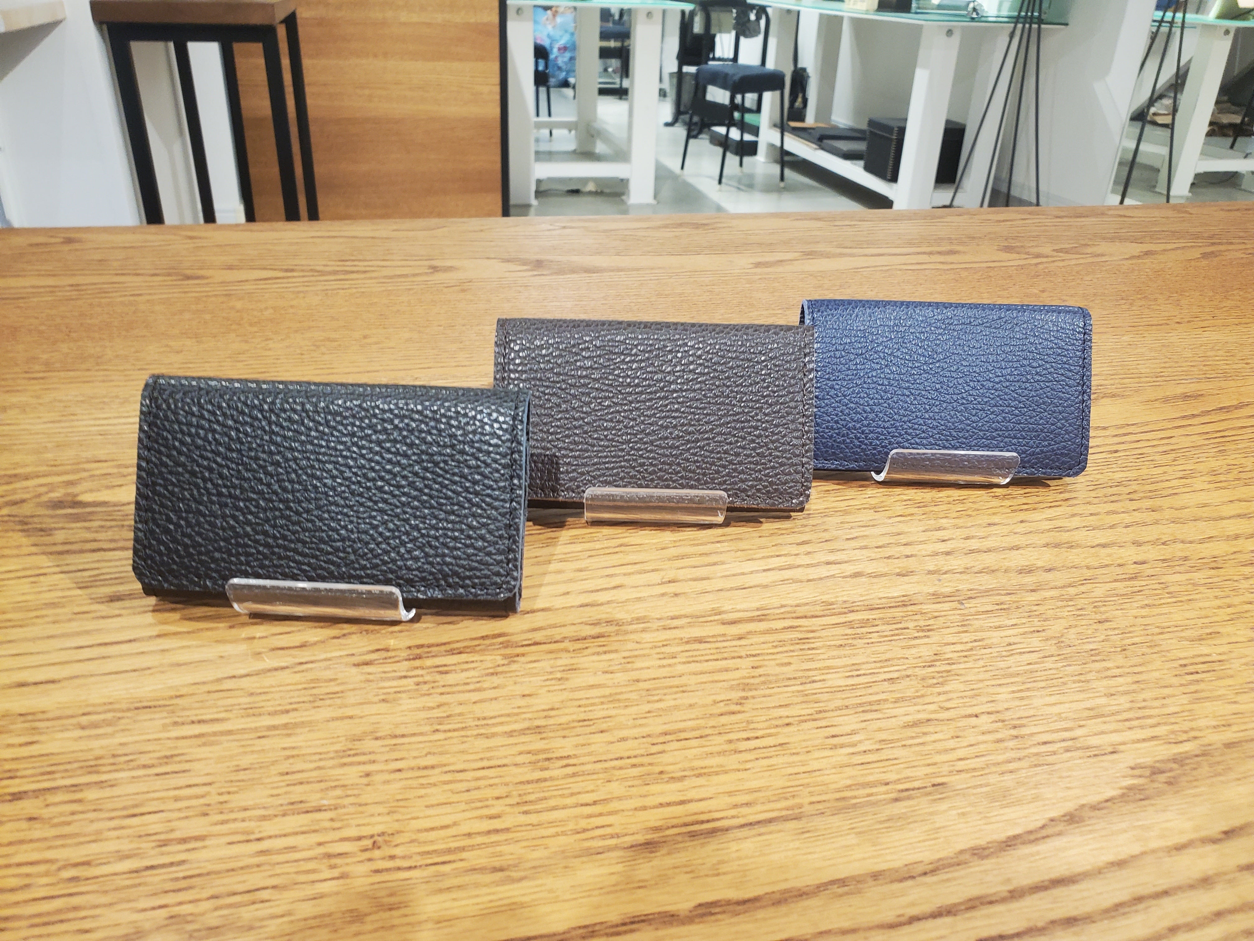 1. イタリアンレザーシボの型押しが特徴で、ふわっと柔らかな触り心地。鮮やかな発色と、切りっぱなしのコバがカジュアルさと洗練さを両立。日常使いでも可能。カラー:ブラック、ダークブラウン、ネイビー。