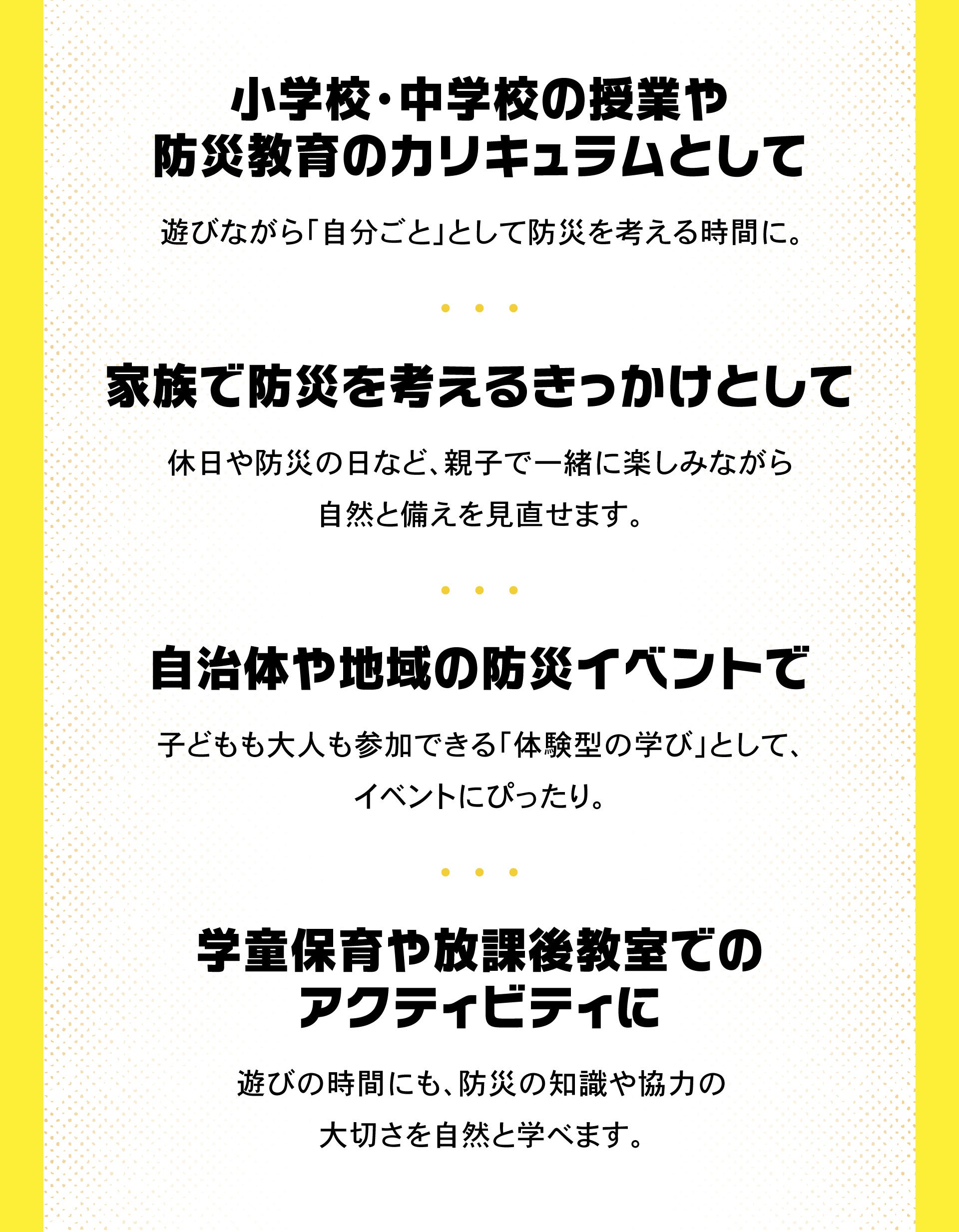 防災教材は数多くありますが、「楽しさ」と「学びやすさ」の両立を目指した本作は、授業・特別活動・イベントなど、さまざまなシーンで活用いただける内容になっています。