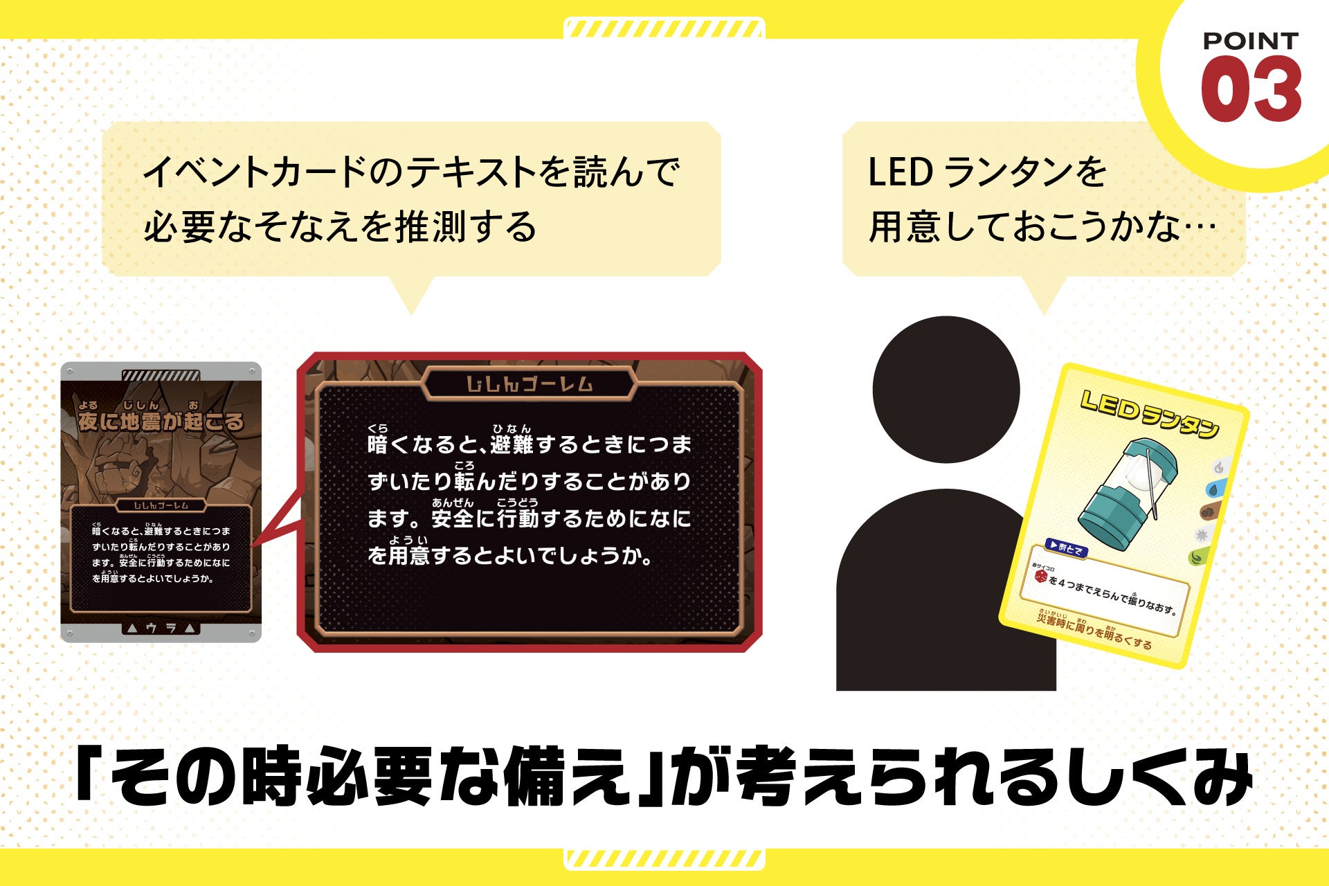 イベントカードに記されたシチュエーションを見て、「どんな備えが必要か?」を自分で予想します。