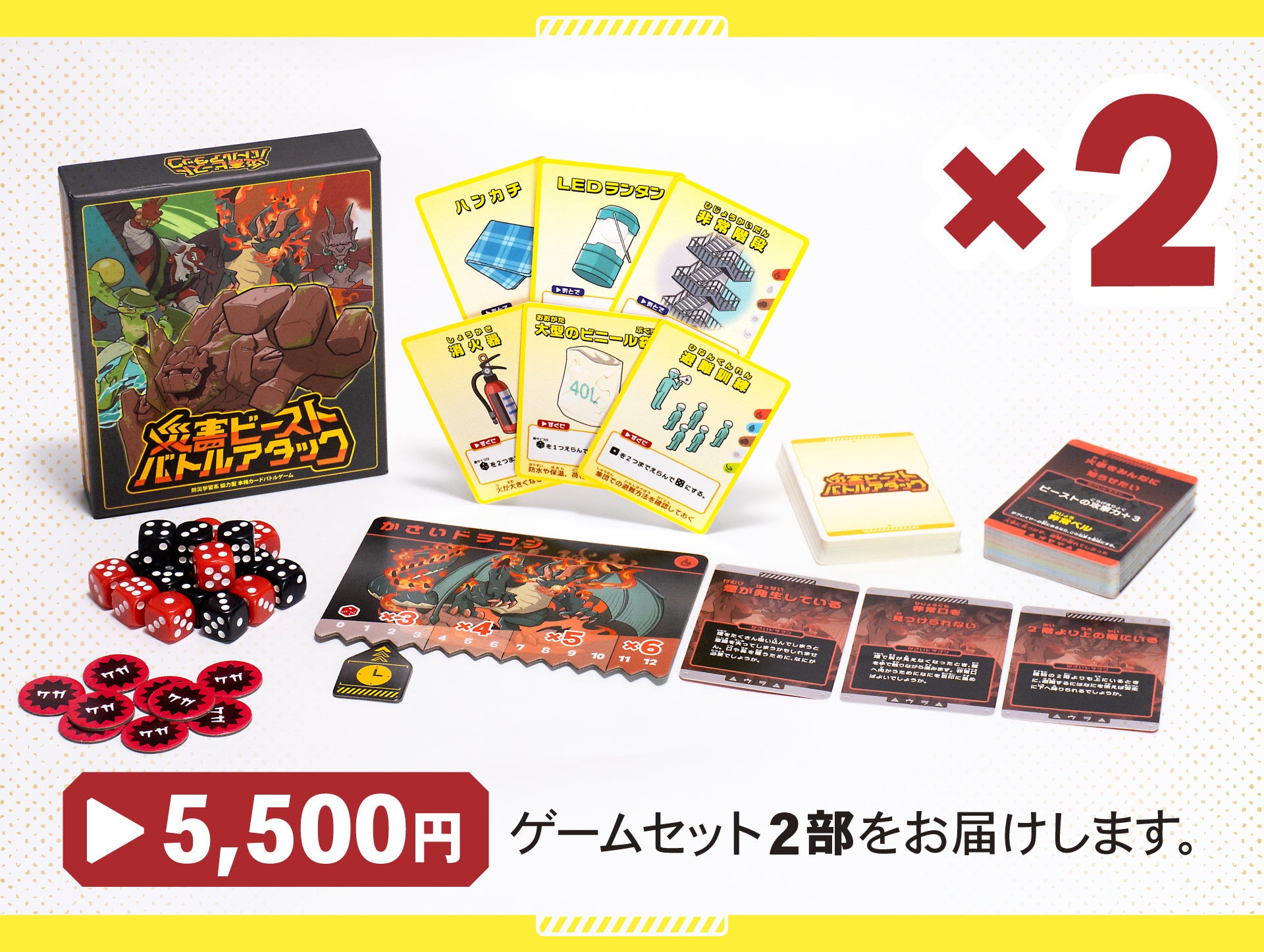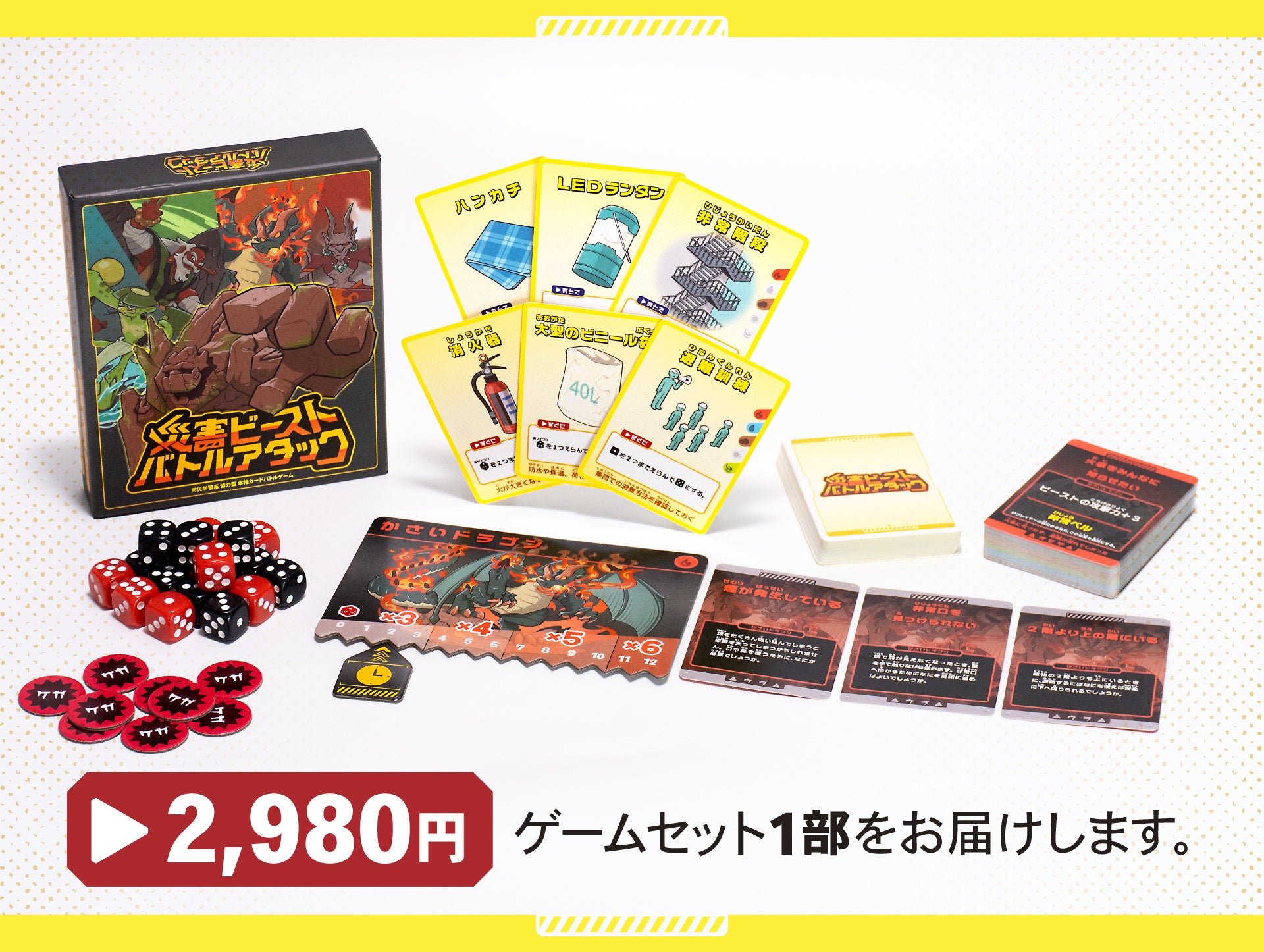2025/11/05 15:59クラウドファンディングで『災害ビースト・バトルアタック』を応援してくださった皆さまへ多くのご支援・ご声援をいただき、誠にありがとうございました。皆さまのお力添えにより、ついに本作が 一般販売に向けて始動いたしました。このたび、11月21日の全国発売に先がけて、各種量販店・ネット通販サイトにて「先行予約販売」がスタート しました!希望小売価格:2,980円(税込)発売日:2025年11月21日(金)販売形態:全国主要量販店・玩具専門店・各種オンラインショップにて販売一般販売に向けてのプレスリリースhttps://prtimes.jp/main/html/rd/p/000000083.000085174.html参考情報:現在把握できているオンラインショップの先行予約販売先URLhttps://www.yodobashi.com/product/100000001009515286/https://item.rakuten.co.jp/jism/4582262801213-55-67697-n/https://item.rakuten.co.jp/baton-store/sbga-08871/https://item.rakuten.co.jp/boardgame-album/024-1213/https://bodogekitao.com/items/68ff1c7b9ad1d5263258c7ddhttps://www.suruga-ya.jp/product/detail/607666307https://store.shopping.yahoo.co.jp/baton-store/sbga-08871.html?sc_i=shopping-pc-web-result-storesch-rsltlst-img───────────────────災害ビースト・バトルアタック開発チーム もっと見るご支援いただいた皆さまへ