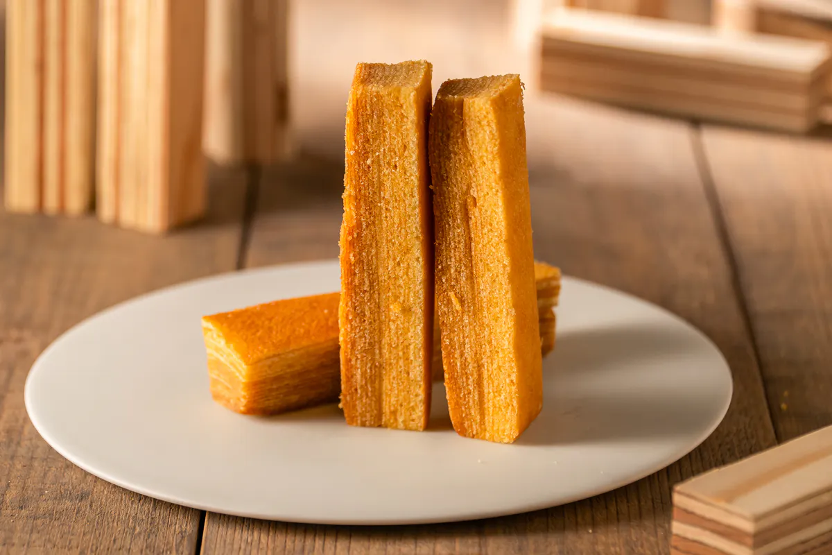隙間から見えるバームクーヘンの生地も「木材のようにみえる」イメージ