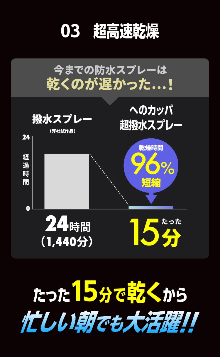 本製品はスプレーしてわずか15分で乾燥する効果があります。