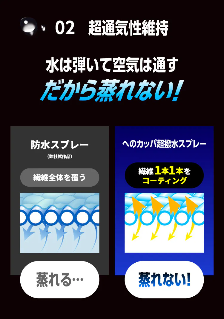 超撥水スプレーは細かい繊維の1本1本をコーティングするため
