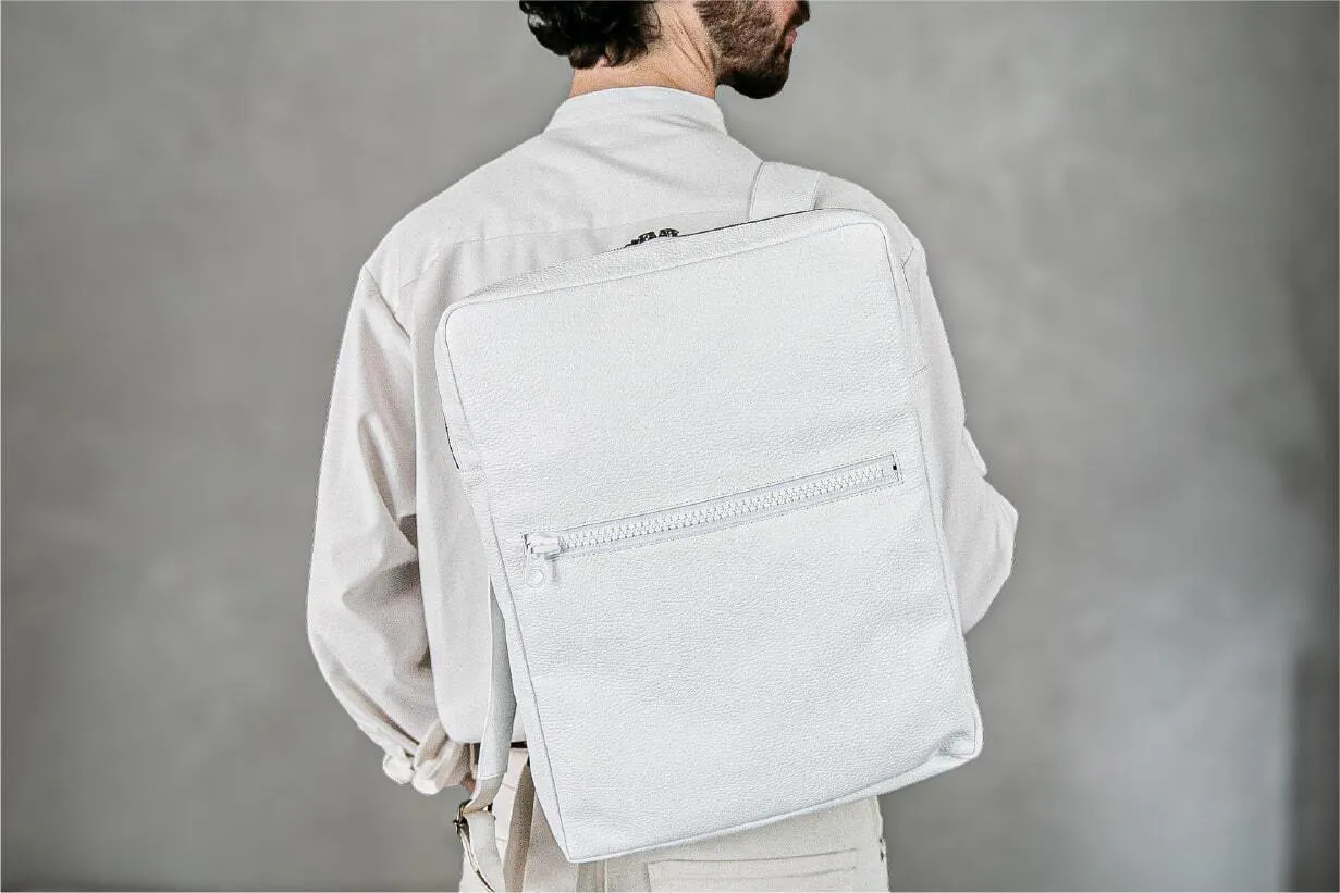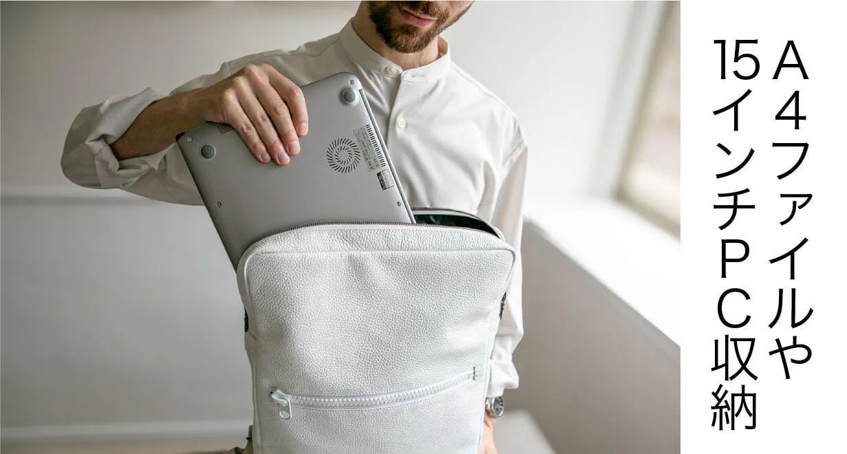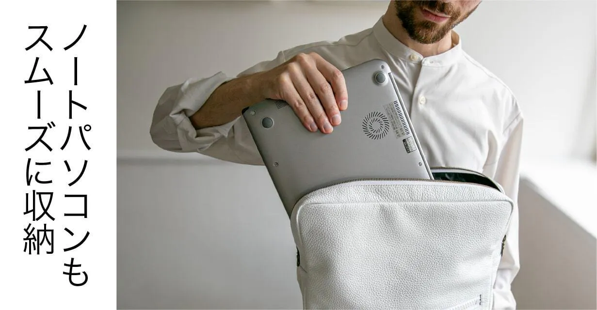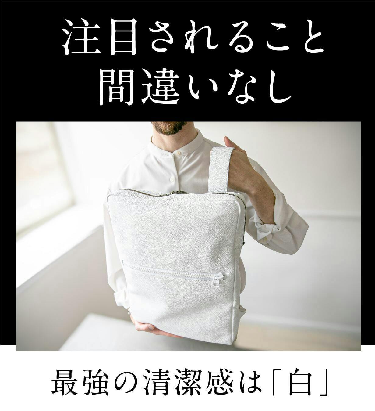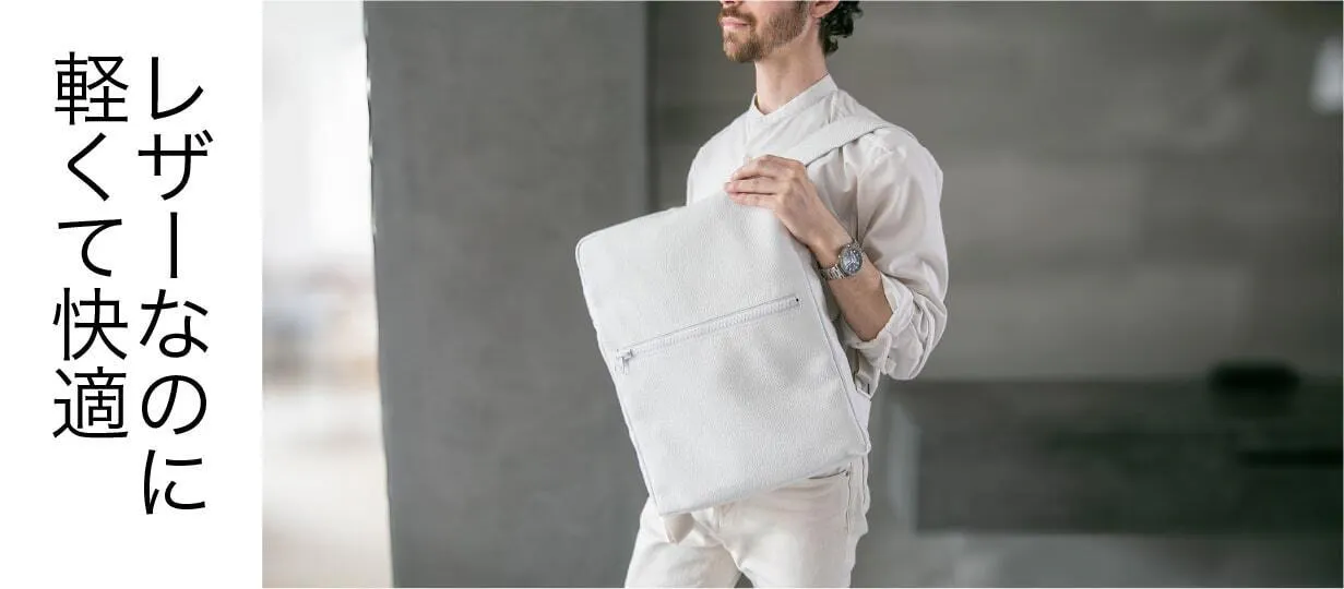 清潔感と洗練された印象を兼ね備えたホワイトレザー。このバッグを持つだけで、あなたの存在感が際立ちます。街中でもひときわ目を引く美しい発色とミニマルなデザインが、大人の男性にふさわしい上品さを演出。