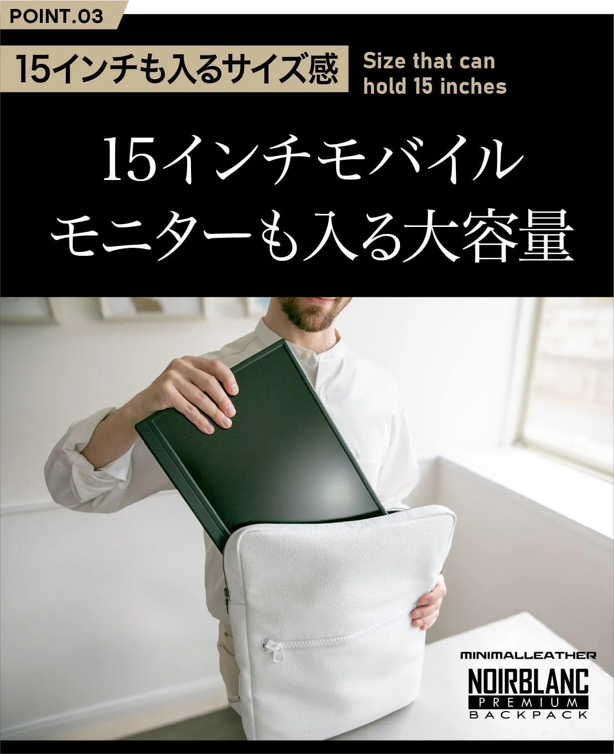 15インチモバイルモニター、15インチノートパソコン、iPadや長財布、スマートフォン、モバイルバッテリーまで、必要なアイテムをすっきりと収納できる大容量が魅力。見た目はコンパクトながら、想像以上の収納力で、荷物が多くなる日常でもスマートに対応します。