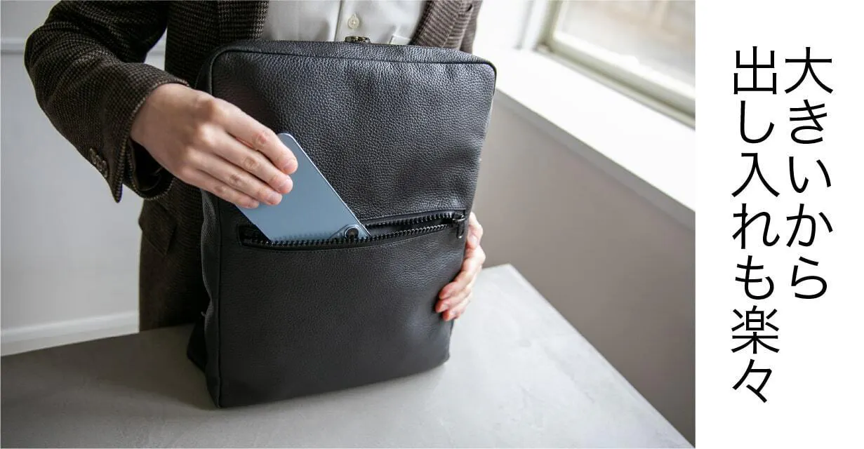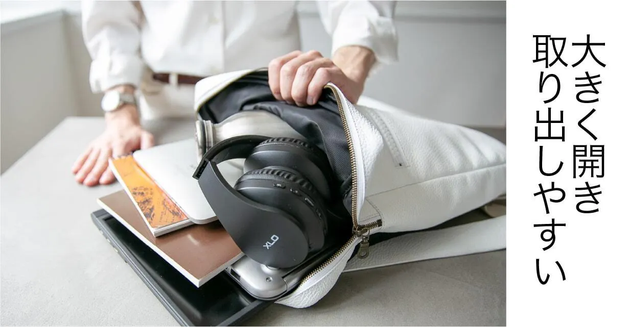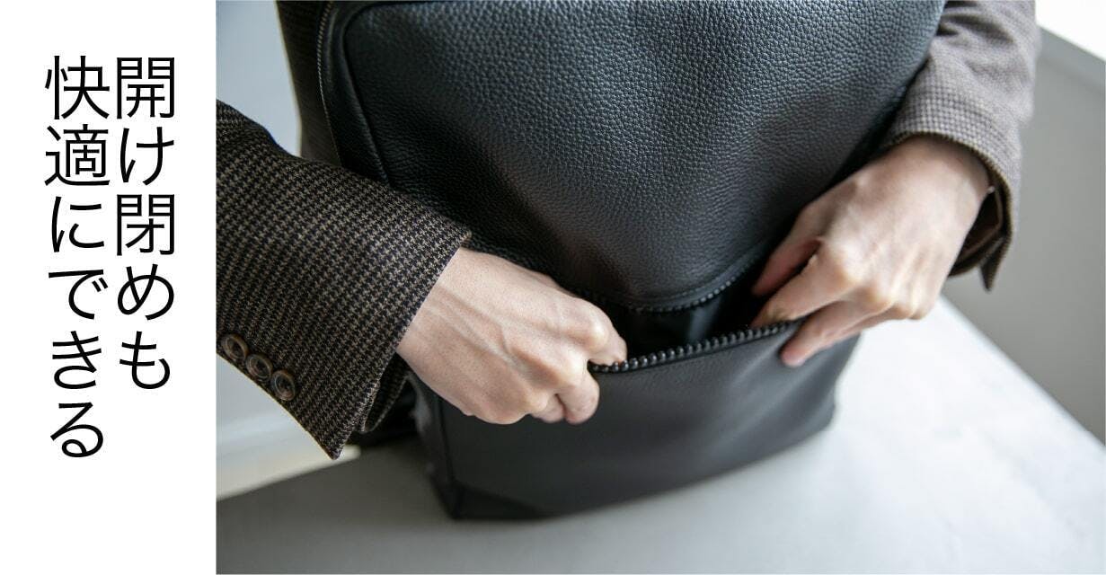 両開きのファスナーは、リュックの上部を広く開けられるので、中身が一目で分かり、必要なものをすぐに取り出せる便利な設計。特に混雑した通勤電車や急いでいるときなど、時間を無駄にしない快適な使い心地を提供します。