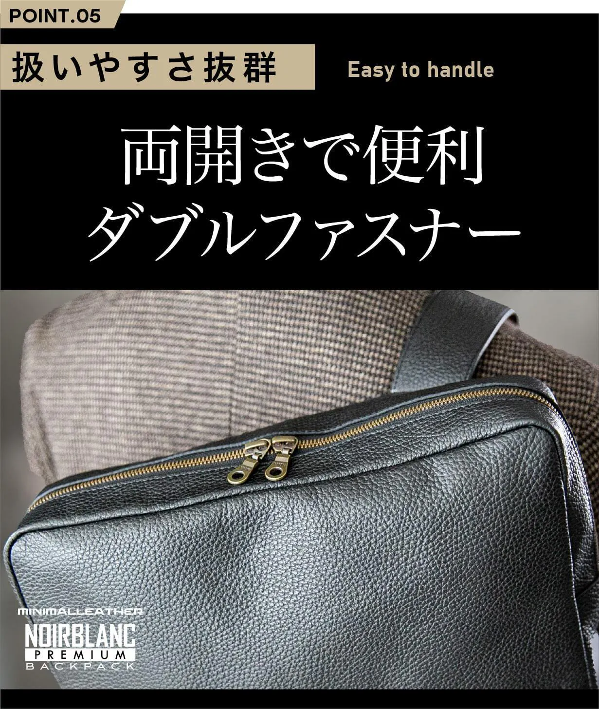 ダブルファスナー仕様で、左右どちらからでもスムーズに開閉可能。使うシーンや持ち方に応じて柔軟に対応できるため、忙しい毎日のストレスを軽減します。