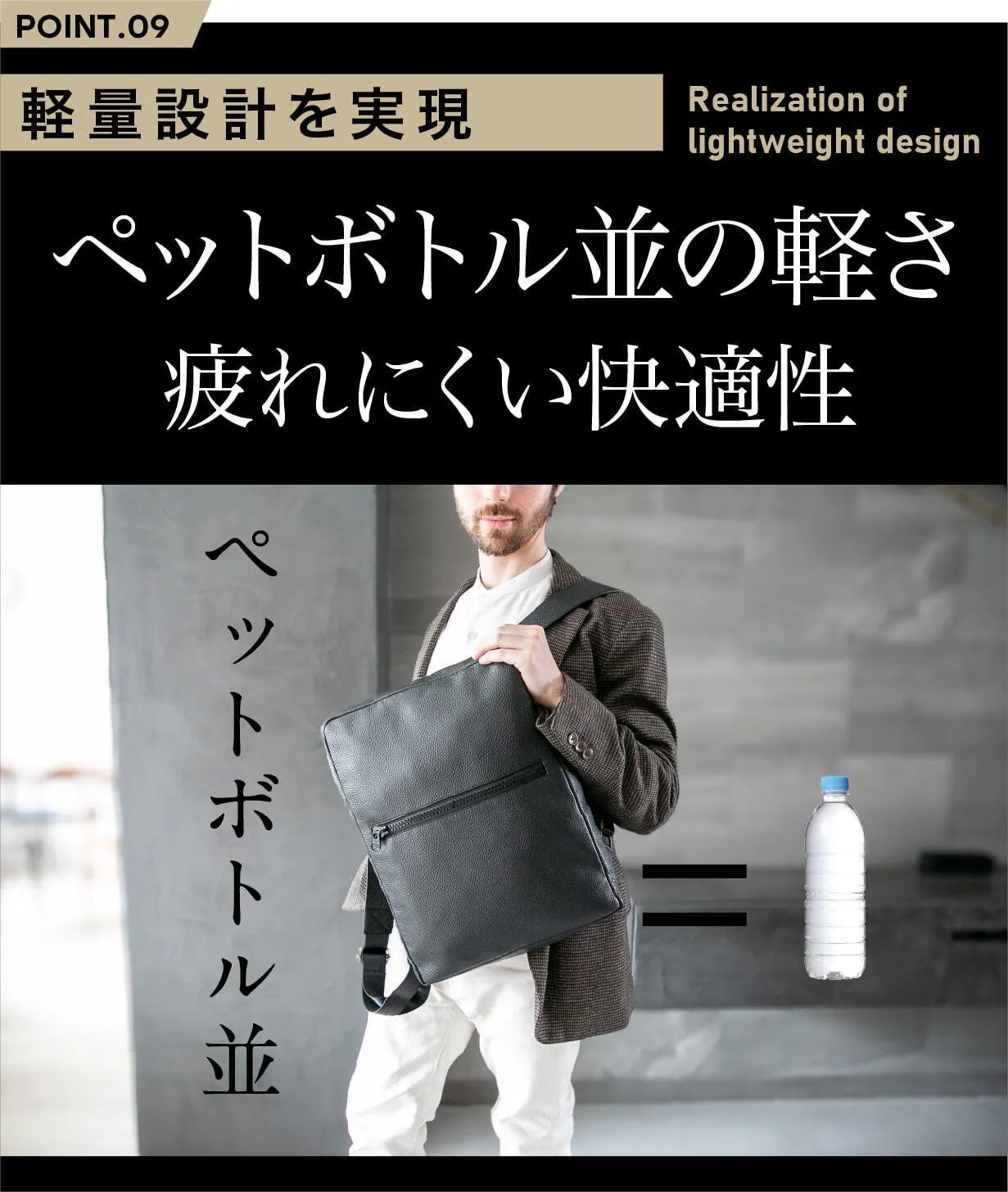 なんと、このレザーリュックはペットボトル並の圧倒的軽さを実現!背負って3秒で衝撃を受けるでしょう。おしゃれなのに快適です。