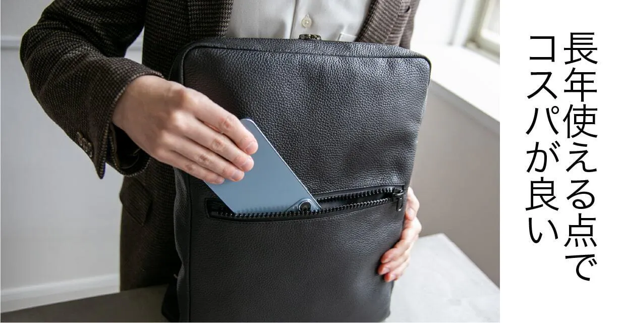 ケチャップやマヨネーズなど、日常で起こりがちな汚れも心配ありません。撥水加工を施したイタリアンレザーを採用しているため、汚れてもサッと拭くだけで簡単にきれいになります。食事や外出先でも気兼ねなく使える実用性と、高級感あるデザインを兼ね備えたこのレザーリュックは、大人のライフスタイルにぴったりです。