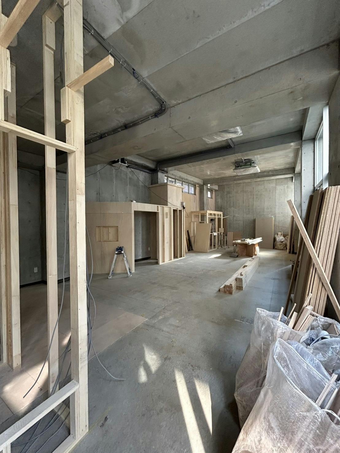 ジム内装は現在、既に壁面部分のセットの立て込みが行われており、その形が姿を現しております!