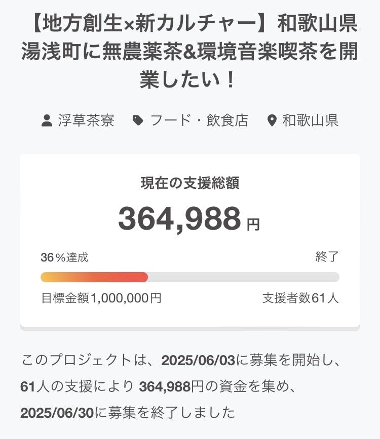 2025/07/31 12:10活動報告が遅れてしまい、大変申し訳ありません!!開業まで毎日ノンストップで改修作業等を進め、7/24日から無事 浮草茶寮をオープンする事が出来ました!!皆様の御支援のおかげで、エアコンをつけたり、茶葉を仕入れる事が出来ました◎↓7/24、7/25に開催された浮草茶寮オープニングギャザリングでの一コマ。この集いにより一気に場が開けました。浮草茶寮開店祭 動画木曜定休の通常営業10:00-21:00となっております。また週末土曜日は音楽を集まって聴ける様にカジュアルなイベント営業なども企画していきます。さてクラファン返礼品の準備が進んでおります!到着まで、もう少しお待ち下さい。お待たせしてすみません。それでは、皆様のご来店を心よりお待ちしております。ドリンクチケットのリターンを選択してくれた皆様は、来店の際にぜひお声がけ頂ければと!手短な文章ですみませんが、この度は暖かなご支援、本当にありがとうございます。やっと少し落ち着いたので、また活動報告にて進捗を報告出来ればと!引き続き宜しくお願い致します。 もっと見る