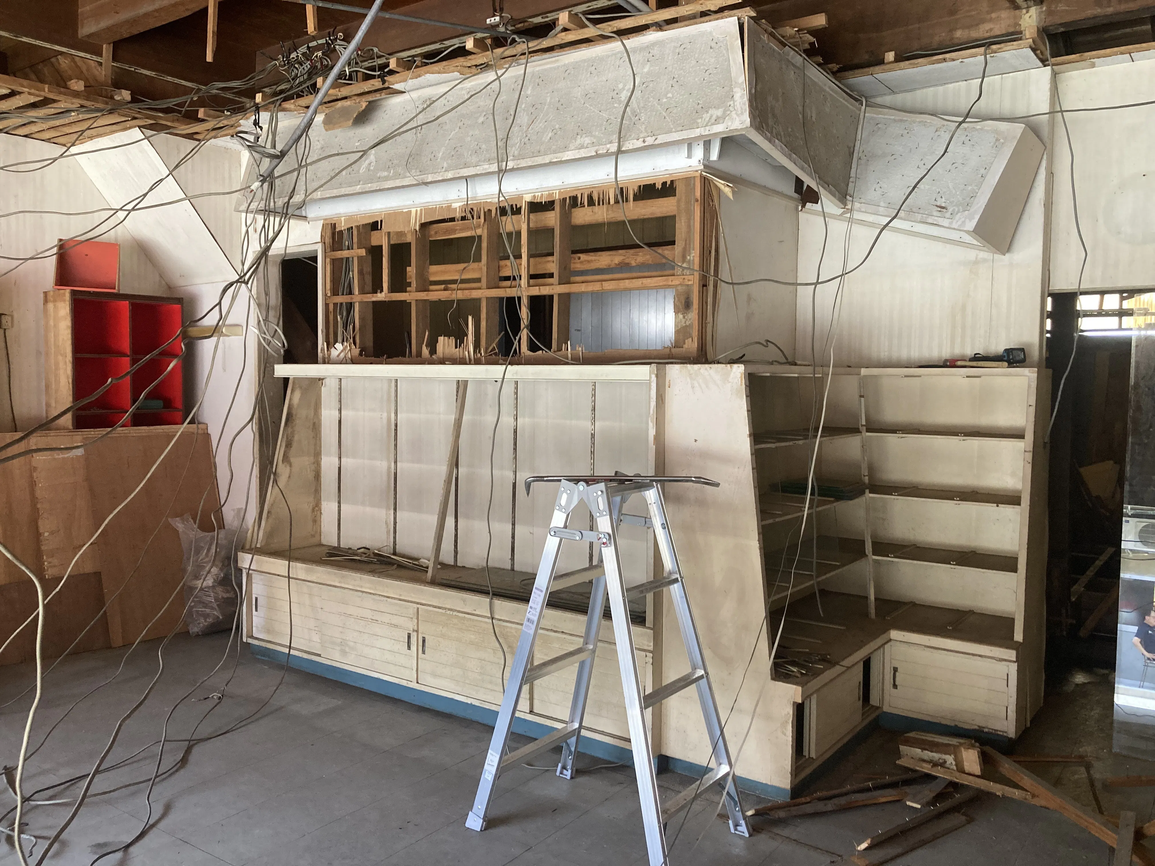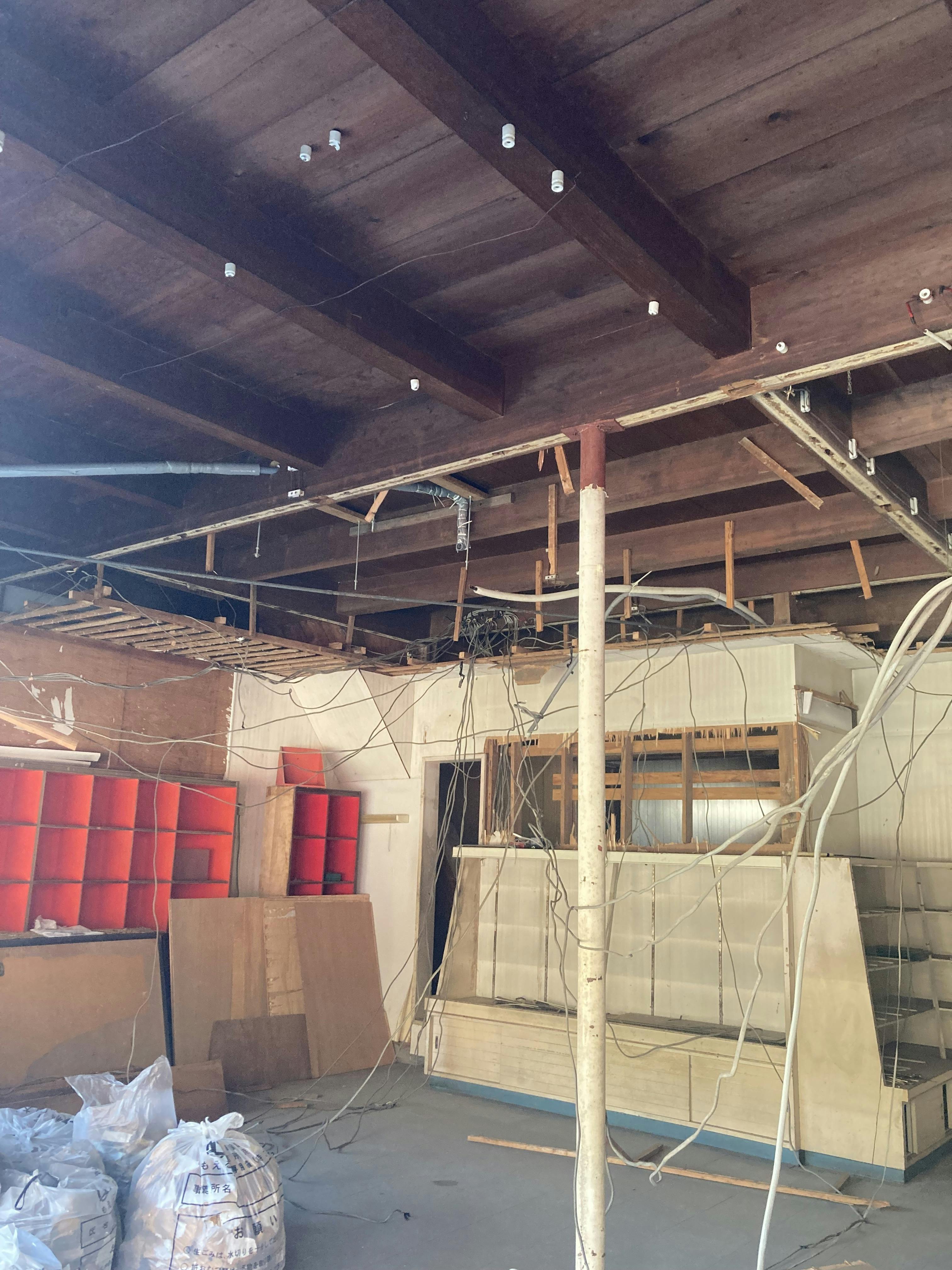 天井の解体ももう少し!解体を進めるにつれ、やはり電線が課題となっています。また、解体と清掃が終われば、水道工事や、塗装などの作業も始められそうです。