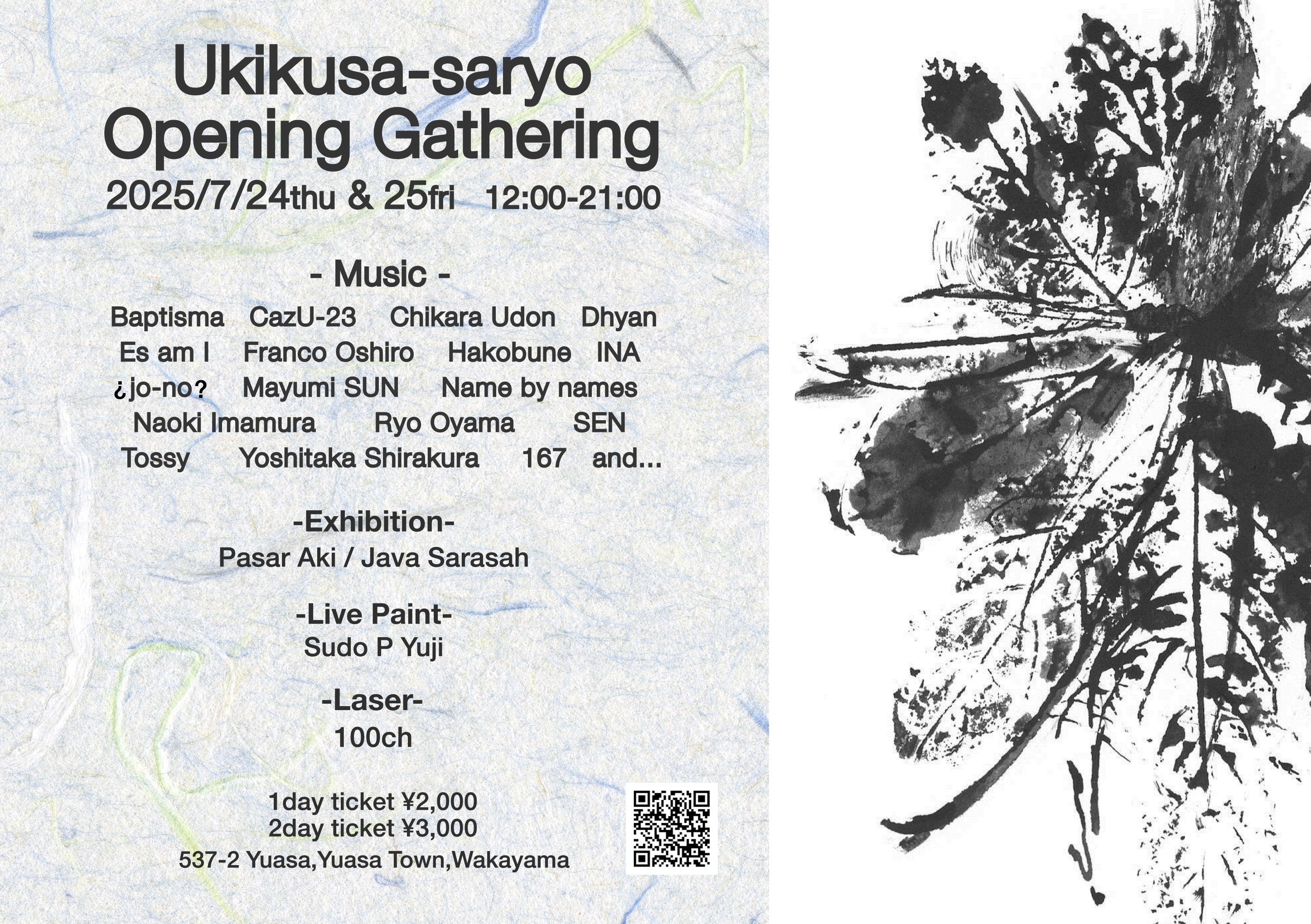 全国各地からディープなシーンで活動する音楽家が集います。また 当店ロゴを作成して頂いた"スドウPユウジ"氏のライブペイントのセッションを行います。これを機に是非 和歌山県は湯浅町 そして新しく始動する浮草茶寮に訪れてみて下さい。
