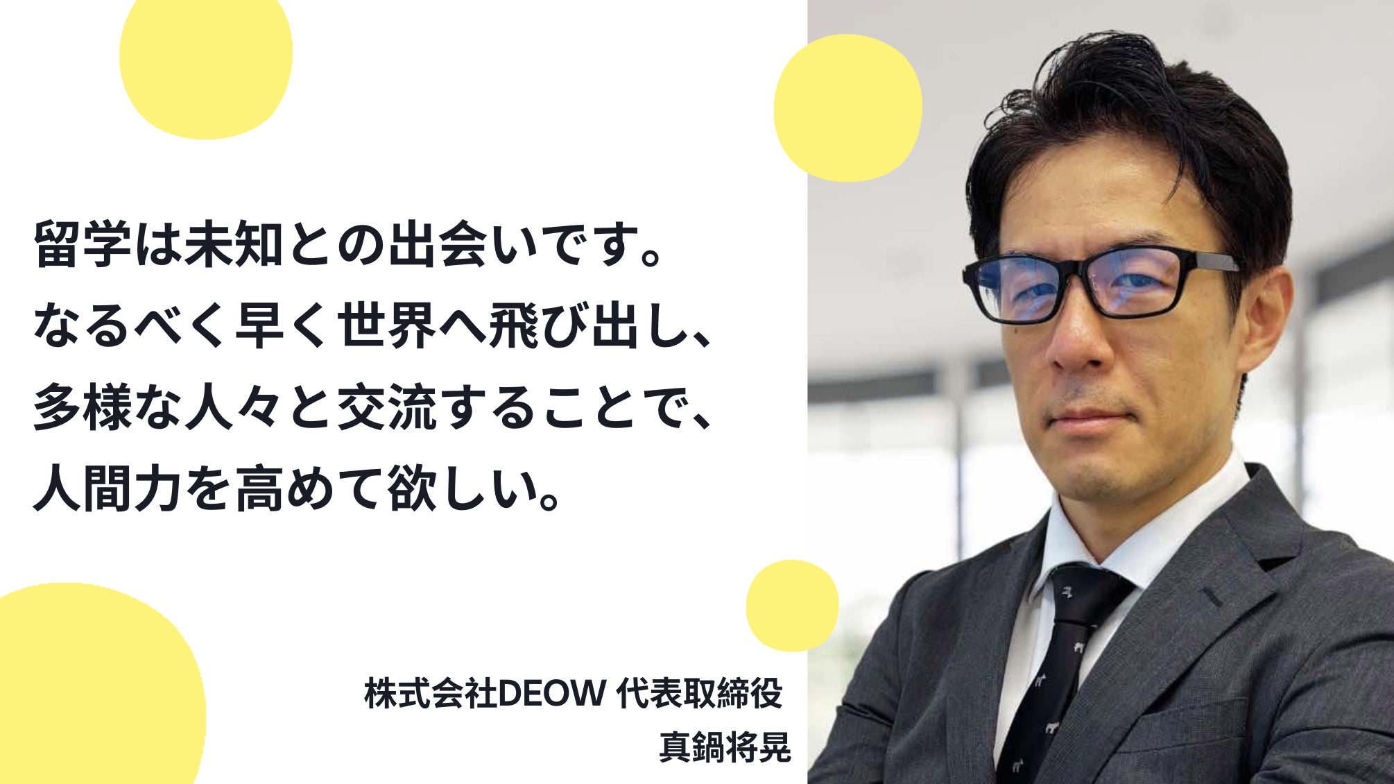 プロフィール:株式会社DEOW代表取締役。慶應義塾大学商学部卒。日本人向けには「留学ワールド」として留学サービスを提供。現在8カ国12都市に直営オフィスを構え、世界中で留学生のサポートを行っている。