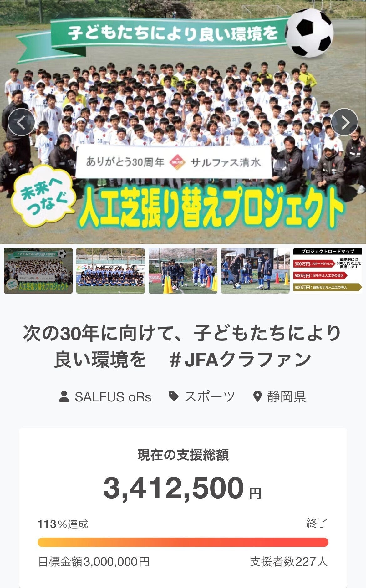 7月18日23:59をもちまして、『サルファス清水30周年 クラウドファンディング』が無事終了いたしました!★最終結果★支援者数:227名支援総額:3,412,500円本当にたくさんの応援をありがとうございました!このクラウドファンディングを通して、30年の歩みを支えてくださった皆さまとのつながり、そして、次の30年に向けてバトンをつなぐ貴重な機会となりました。今後も、子どもたちの夢と成長をサポートできるよう、スタッフ一同、より一層努力してまいります。引き続き、よろしくお願いいたします。