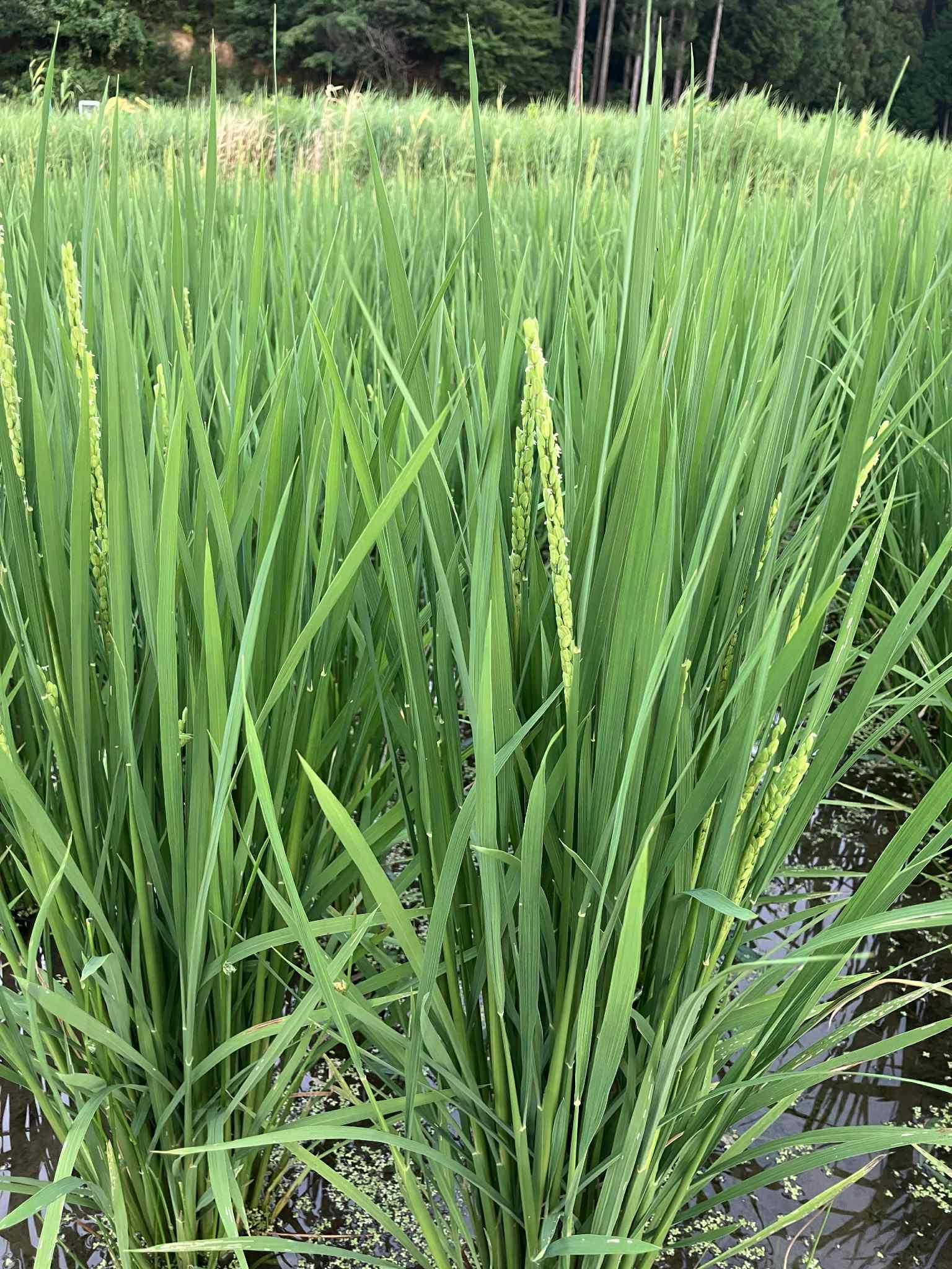 5月29日~30日に2人で植えた開墾途中の田んぼの稲(モチヒカリ)が出穂しました!