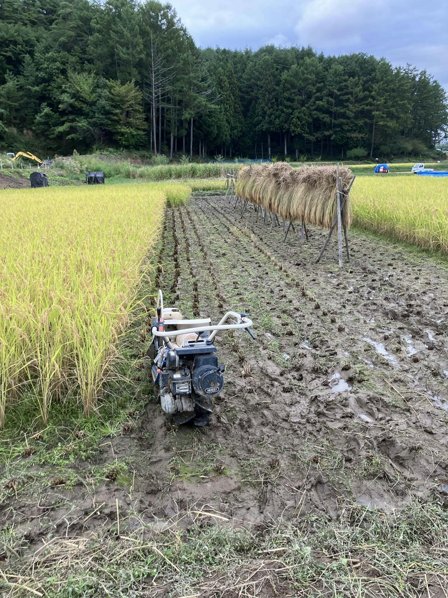 その後、晴れ間を見て少し刈りましたが、機械が田んぼのぬかるみにハマりストップ。