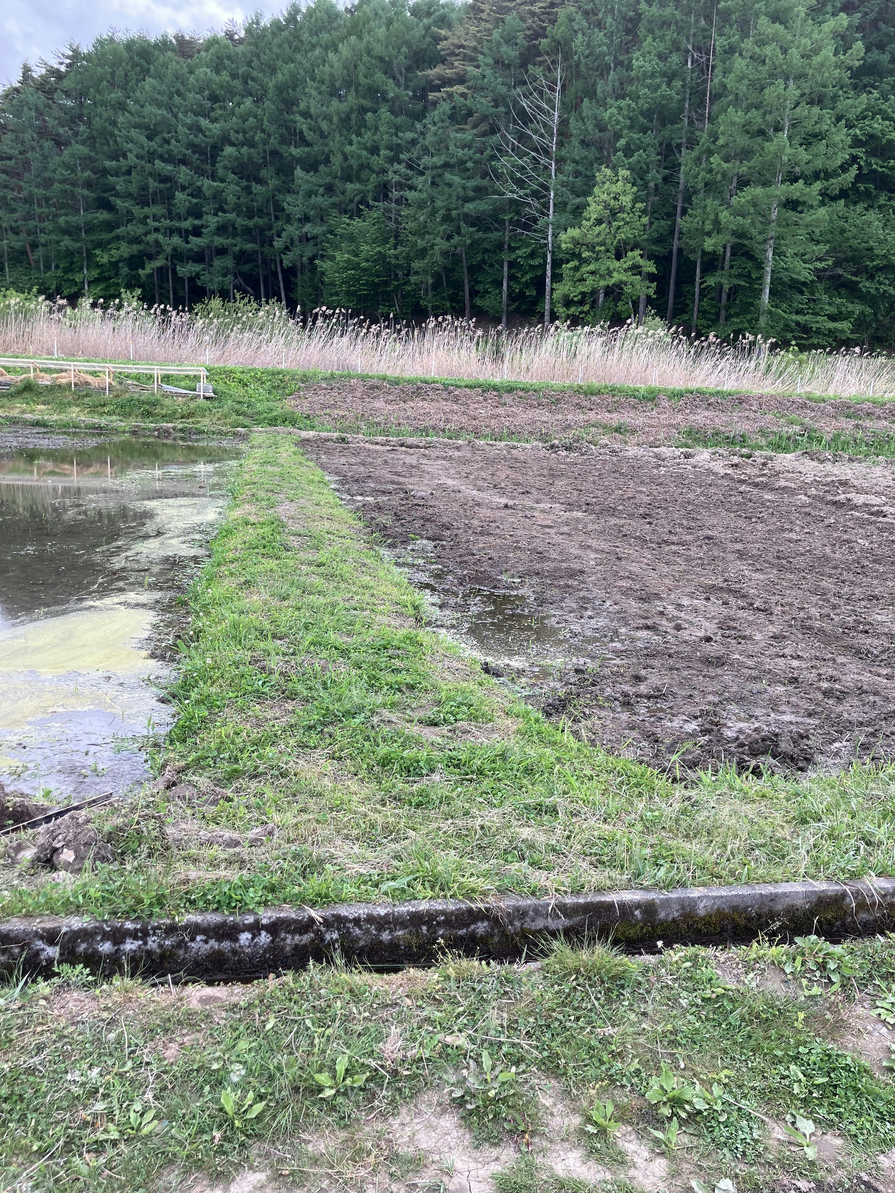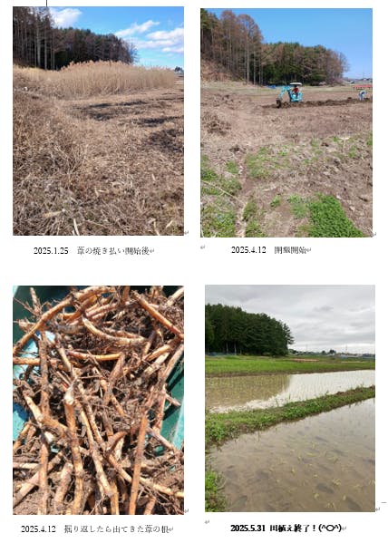 葦を焼き払い始めてから約4か月。ショベルカーで土を掘り起こし、地下にはびこる葦の根を取り除き始めてから1か月半。その間、土を耕したり水を入れて代かきなど行い、本日田植えを終了することができました!ご支援して下さった方々、本当にありがとうございました。m(__)mここまで来るまでに家族や友人、農業機械専門の近所のおじさん達の多くの方々の協力がありました。一方、「こんな所じゃなくても他にも田んぼあるだろ?無謀なことはやめとけ」などの声、「ふ~ん、がんばってるねー」と半分冷やかしの声もありましたが、何とか形にすることができました。1,200㎡の荒地の内、300㎡程ですが無事に田植えを終えることができてホッとしています。先週、仲間と共に田植えを行ったすぐ隣の田んぼを管理する者からして、背丈の倍はある葦ジャングルを解消できたことは、景観や獣害の面から見ても無駄ではないと思っております。今回のプロジェクトの目的は大きく分けて2つ。1.遊休荒廃農地を再生し、田んぼに戻す2. 「自分が食べる米は自分で作る!」社会の7実現へ向けて共同稲作を広める遊休荒廃農地再生はまだまだ続き、随時活動報告を行っていきます。今後とも温かく見守って頂けたら幸いです。
