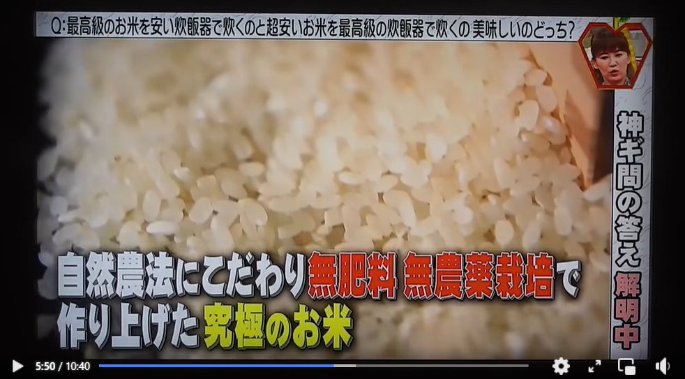 ・2018年6月9日放送のフジテレビ全国放送の神ギ問で、北村広紀の自然米「神の力」対「高級炊飯器」の対決が放送されました。結果は写真下に記載