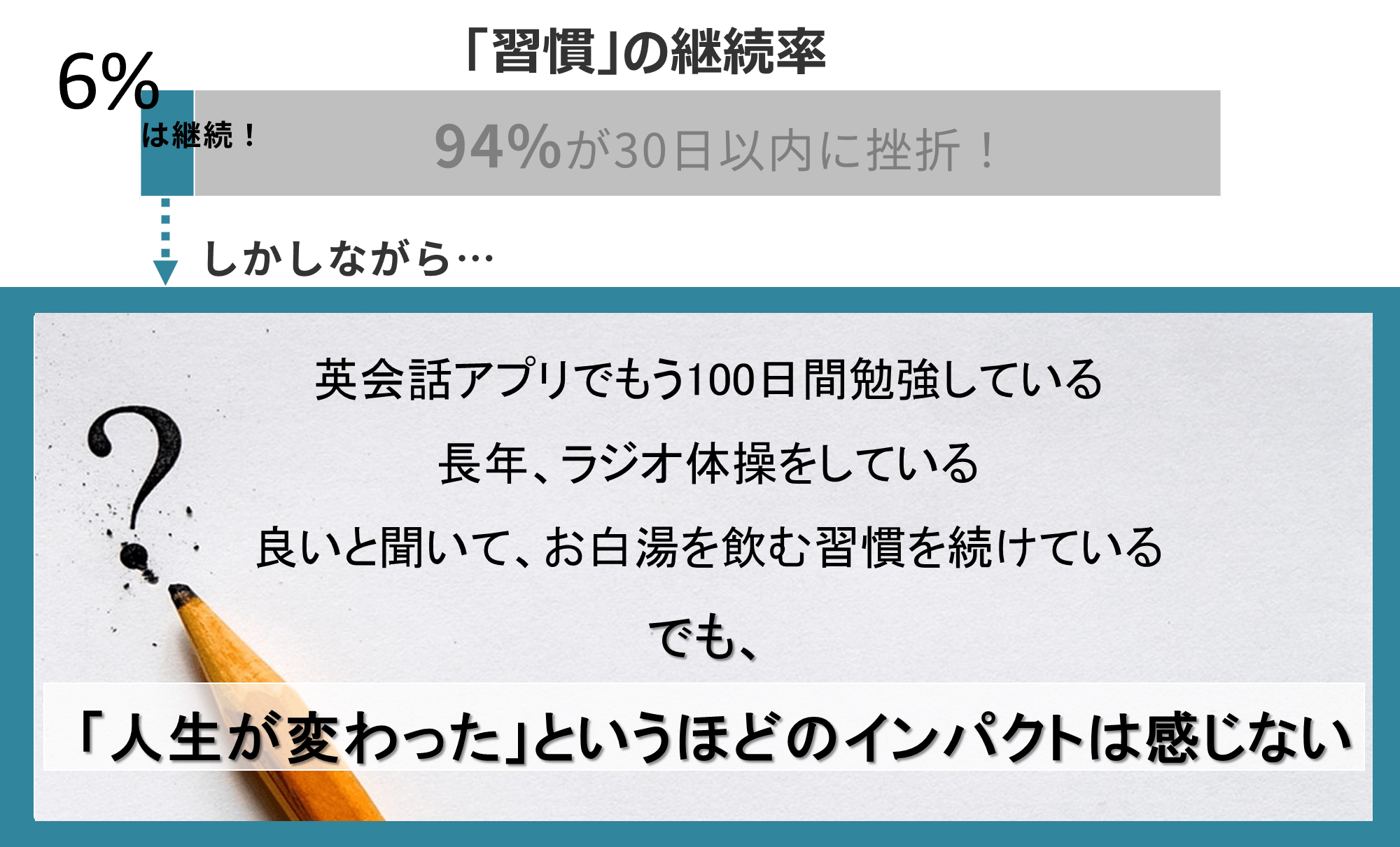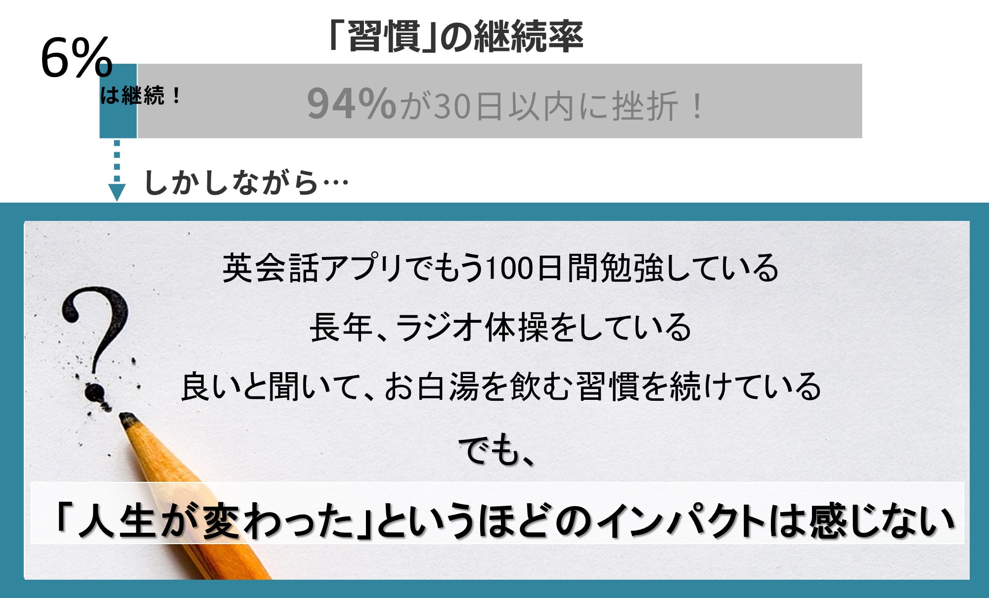 例えば「ランニング習慣」を30日以上継続できる人の割合は全体の6%位だといわれています。つまり、94%が挫折してしまいます。仮にあなたがその6%に入る習慣継続者だとしても、「人生が変わった」というほどのインパクトはないと思っていないでしょうか。