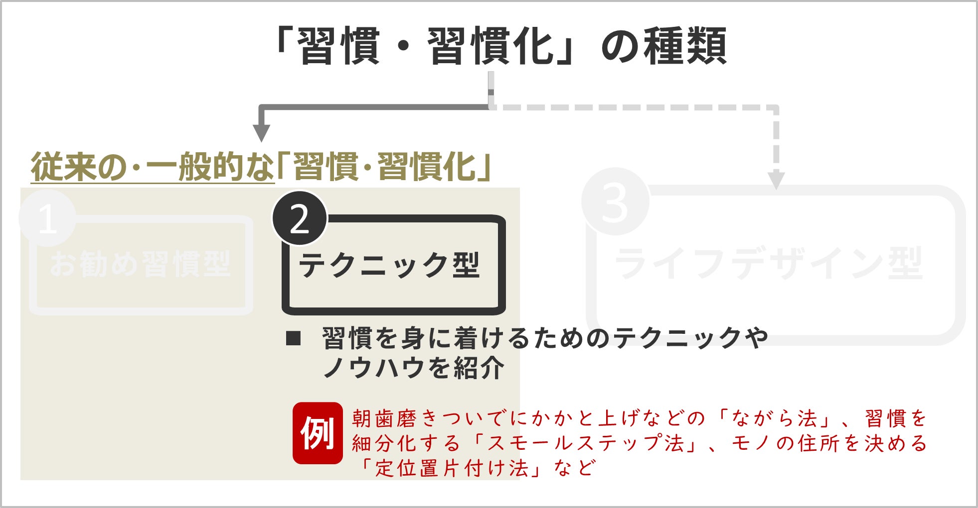 習慣がなかなか身につかなくて、習慣の身に着け方やハウツーを実行していたあなたは「テクニック型」の習慣を学んでいました。