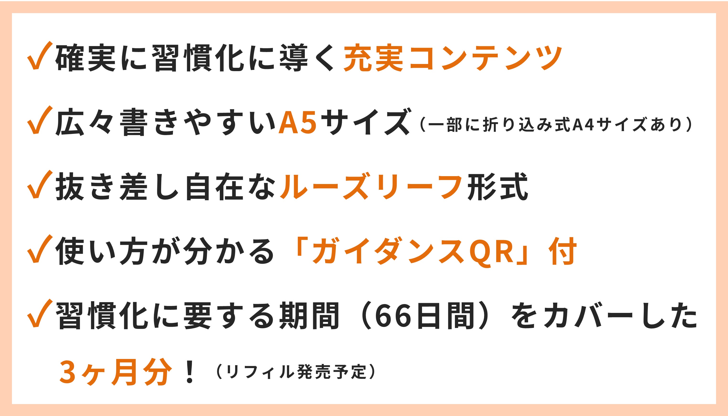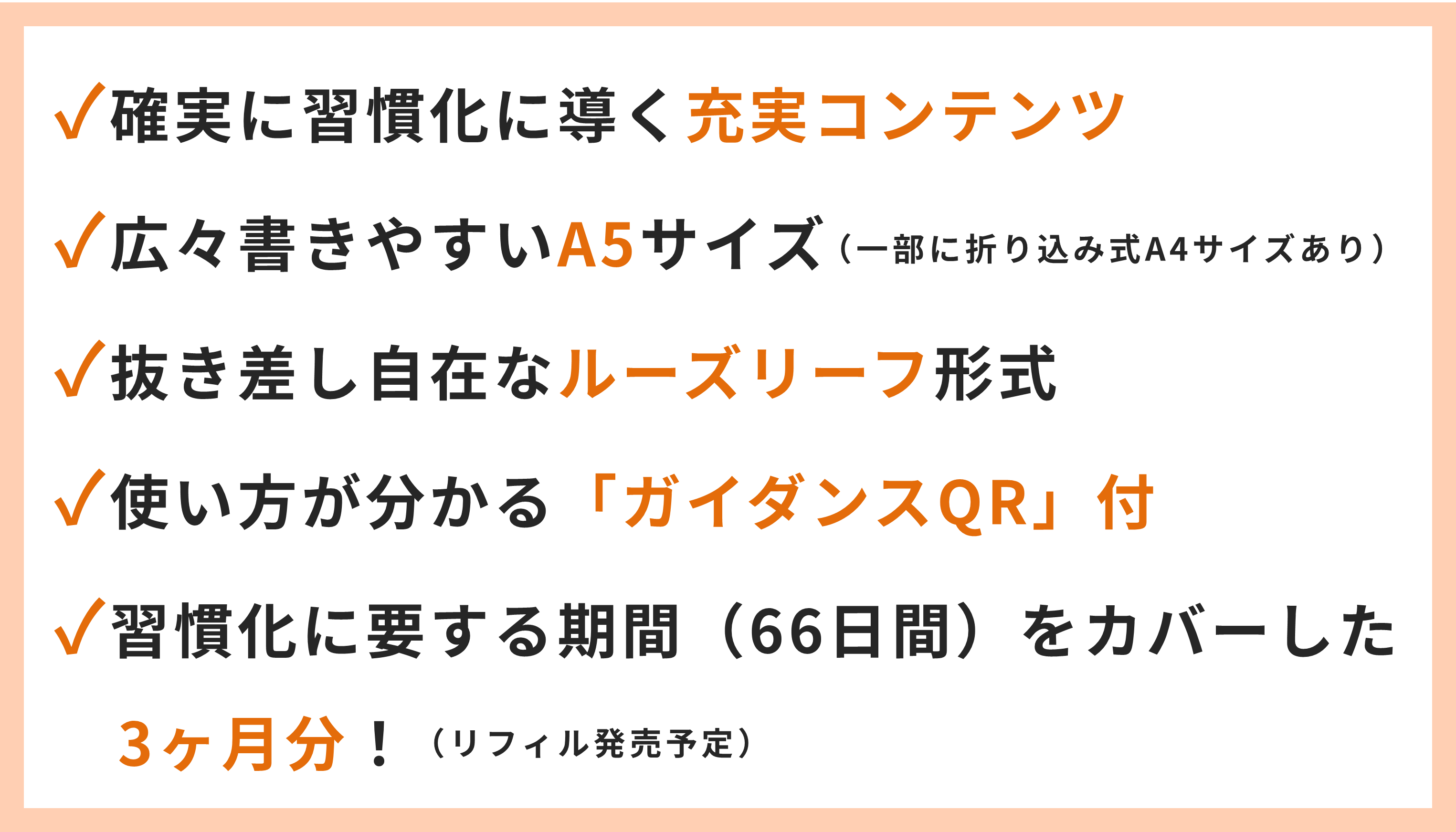 内容に沿って使用していくことで、使う人の「実行スイッチ」が自然にオンになるよう設計されています。