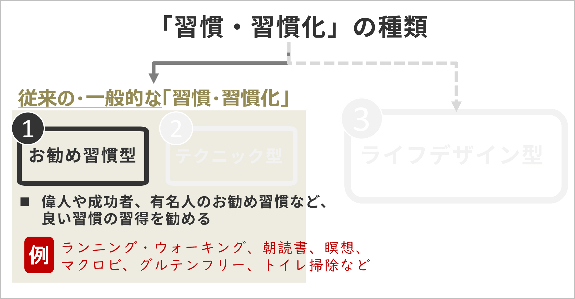 「ライフデザイン型」では、「お勧め習慣型」で紹介されているような一般的に良い習慣(「早起き習慣」や「運動習慣」など)も、「自分の理想のあり方」や「人生のゴール」につながらない場合は必要ないと考えます。あまり認知されておらず、ほとんどの「習慣・習慣化」書籍等でカバーされていない比較的新しい考え方です。