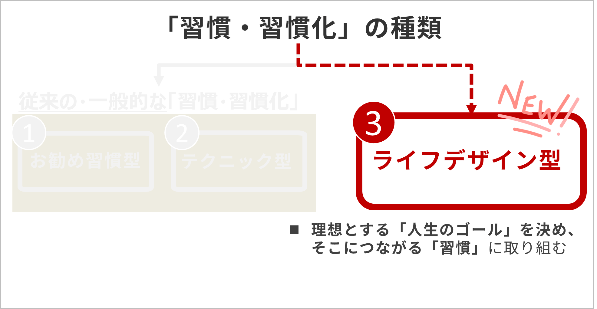 「ライフデザイン型」は、自分が描く人生のゴールに即した習慣に取り組んでいく方法なので、自分が取り組む1つ1つの「習慣」が目指している「人生のゴール」に直接的に繋がっていくのが特徴です。