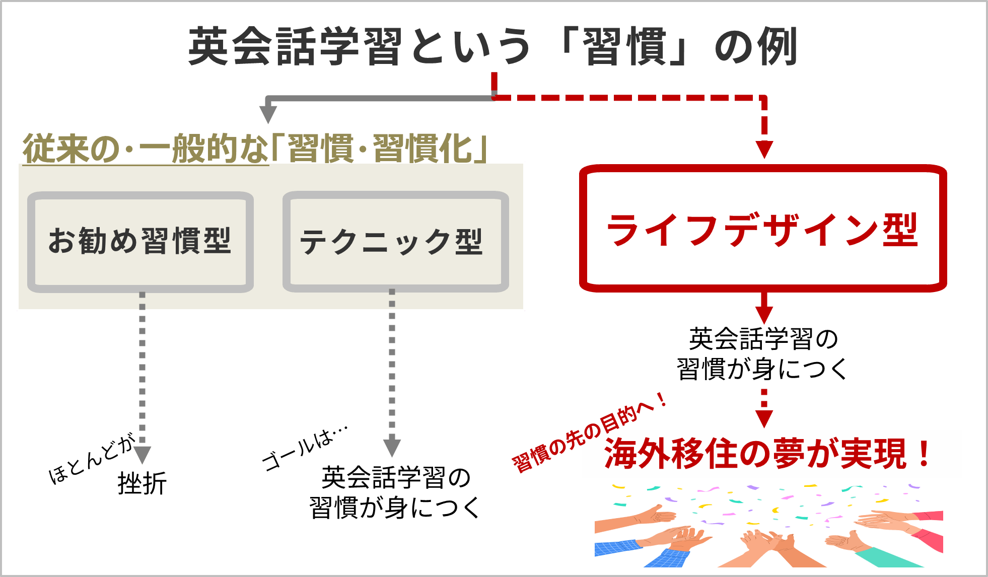 例えば、同じ習慣に取り組むにも、従来の「お勧め習慣型」や「テクニック型」で取り組んだ場合と、「ライフデザイン型」で取り組んだ場合ではたどり着くゴールに以下のような違いが出てきます。