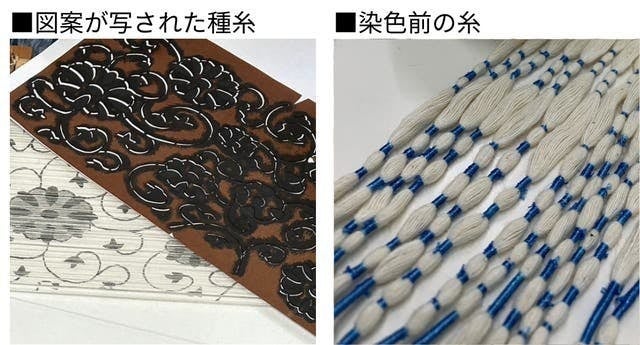 図案を描き、それを種糸に写し、40~60本の糸を束にして染めないところ(白く残すところ)を縛ってから染める、そして織り上げる。