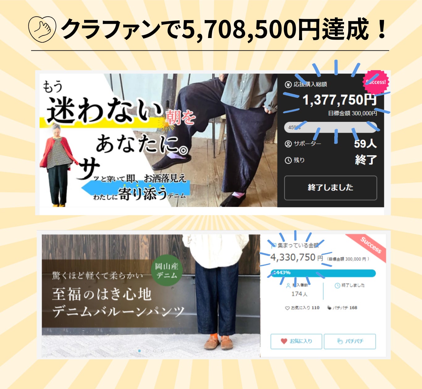 国内のクラファンサイトで多くの方に支持され、"5,708,500円"の支援を達成したデニムバルーンパンツが、キャンプファイヤーにも登場します!!