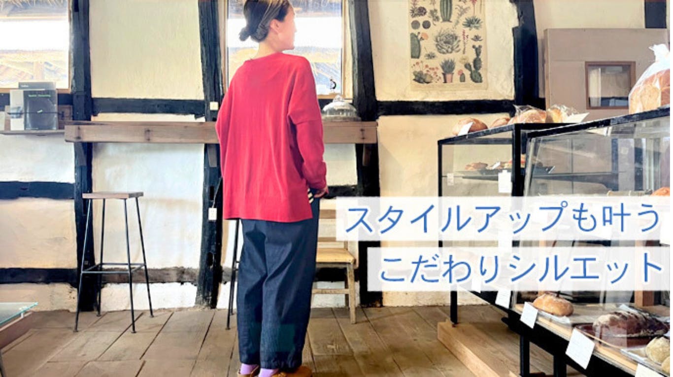 ストレートパンツでは出せない丸みと立体感を生み出し、スタイルアップ効果も狙っています。