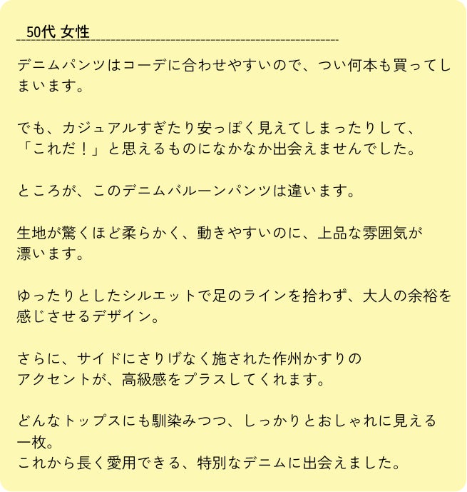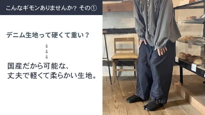 デニムバルーンパンツの開発には、職人としての誇りと地元・岡山への愛を込めました。