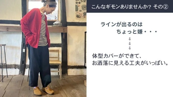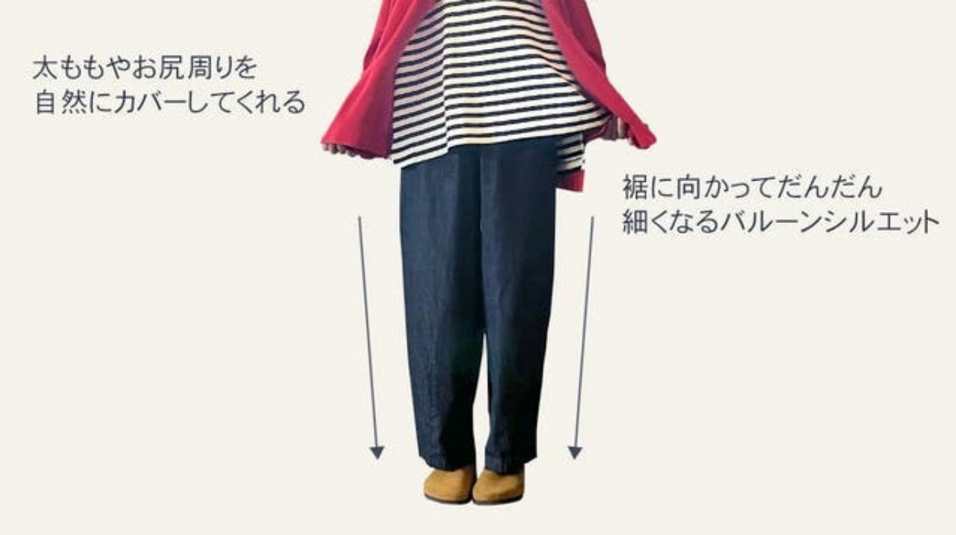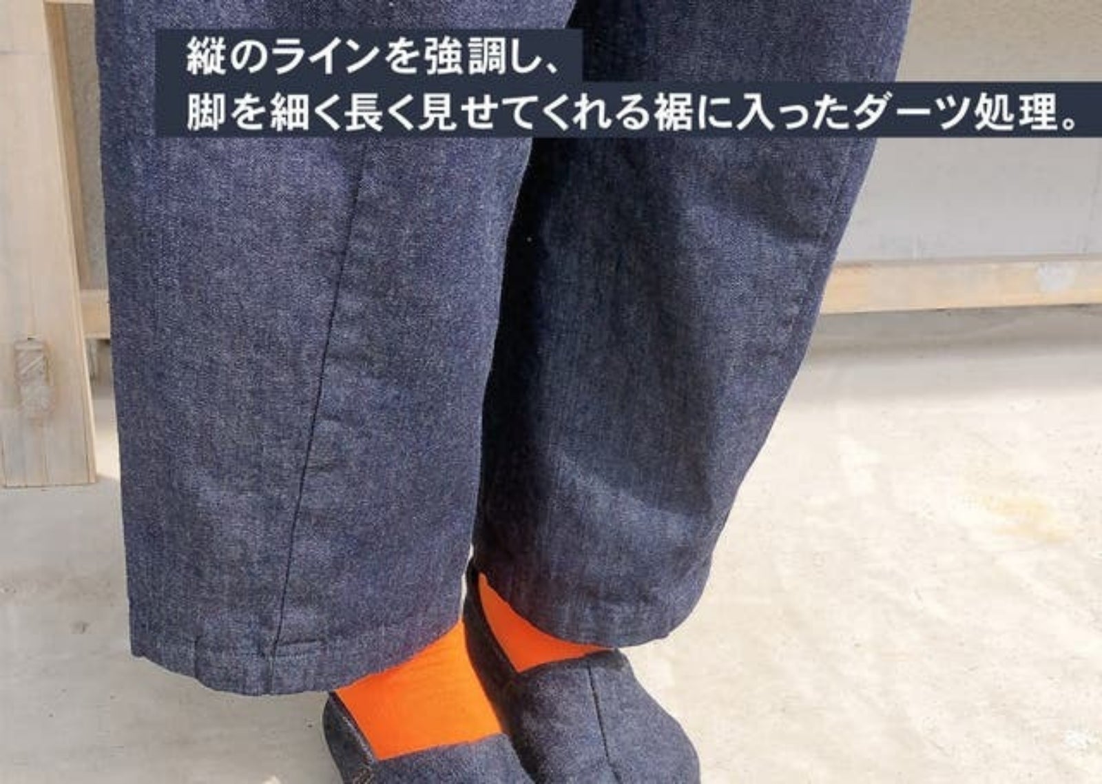 ストレートパンツでは出せない丸みと立体感を生み出し、スタイルアップ効果も狙っています。