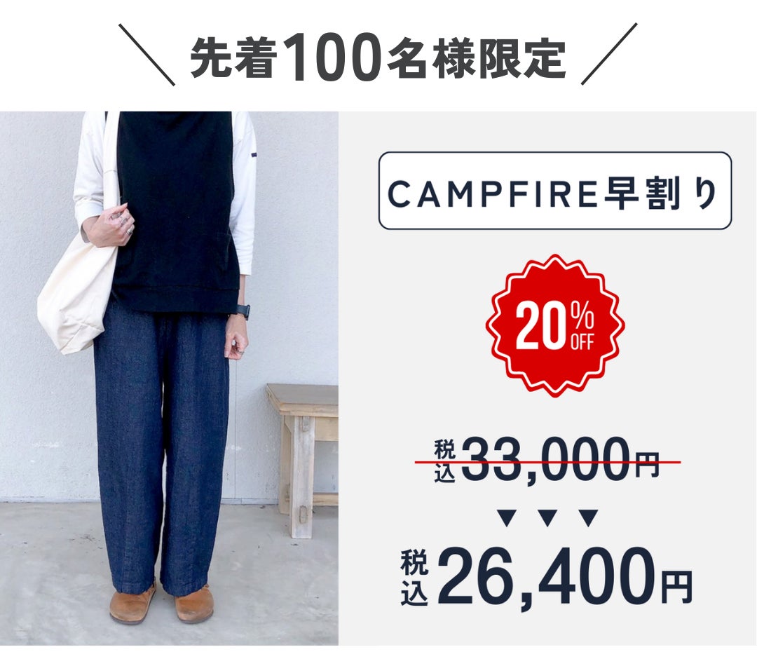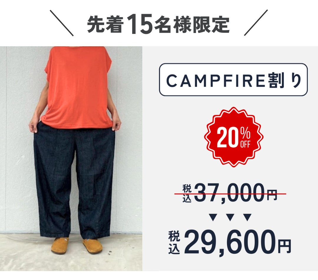 国内のクラファンサイトで多くの方に支持され、"5,708,500円"の支援を達成したデニムバルーンパンツが、キャンプファイヤーにも登場します!!