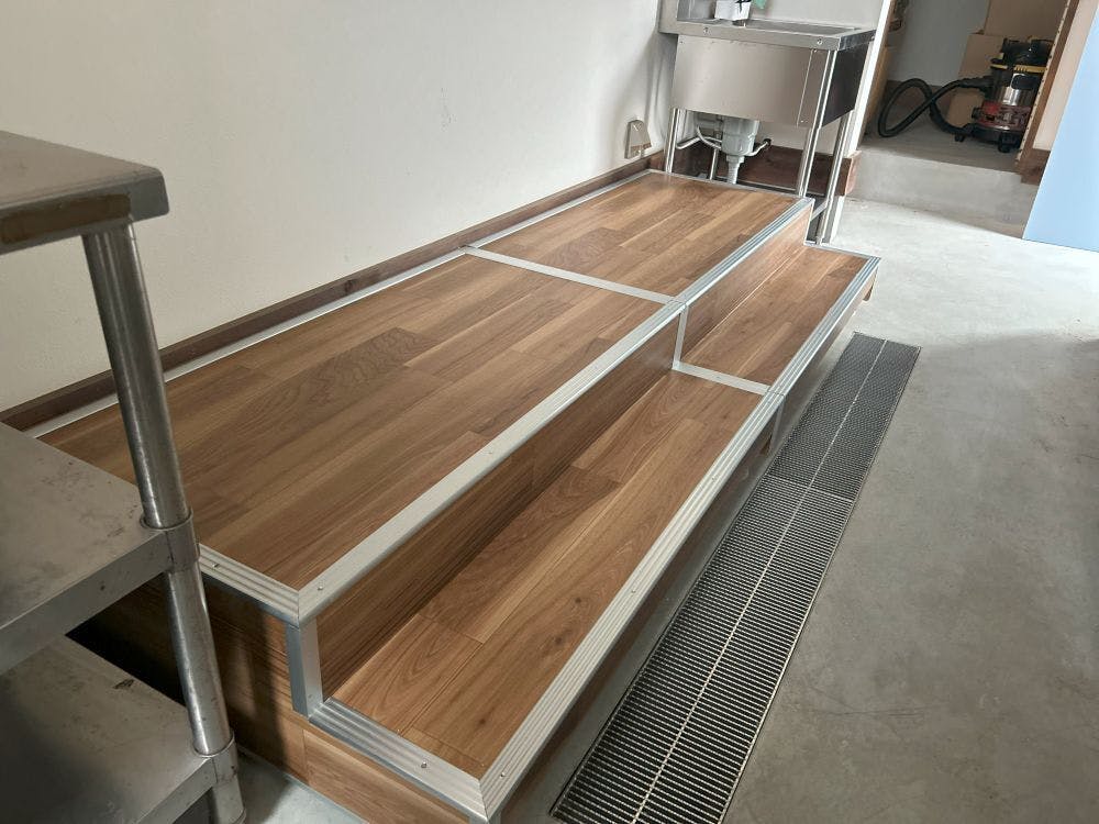 お店全体よりも一段低くなっていた床部分の底上げは、このような形になりました。当初はキッチン全体を底上げする話もありましたが、費用がとてつもないことになるため、業者さんとの話し合いを重ねて最低限かつ使いやすいようにして頂きました。