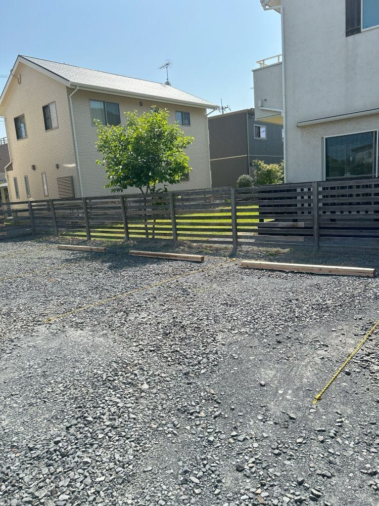 まず駐車場スペースは4台確保してあります。区画整備を終えて、車止めも手作りで作ってみました。写真にある木材がある部分が、WASHI no COFFEEの駐車スペースになります。駐車場自体はオーナー様との共用になるので、予めご理解をお願いいたします。