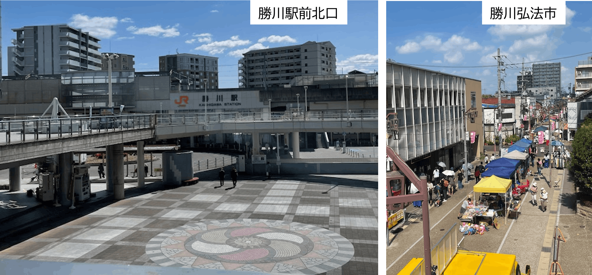 勝川は名古屋のベッドタウンとして発展している街。小学校の登下校時は子どもたちの元気な声が響きます。商店街は50年以上の歴史があり、毎月開催される勝川弘法市はもうじき250回を数え、毎回多くの人でにぎわいます。整備された駅前広場や商店街にはベンチも多数あり、小学生や中高生から高齢者まで座って語らう姿も毎日見られます。