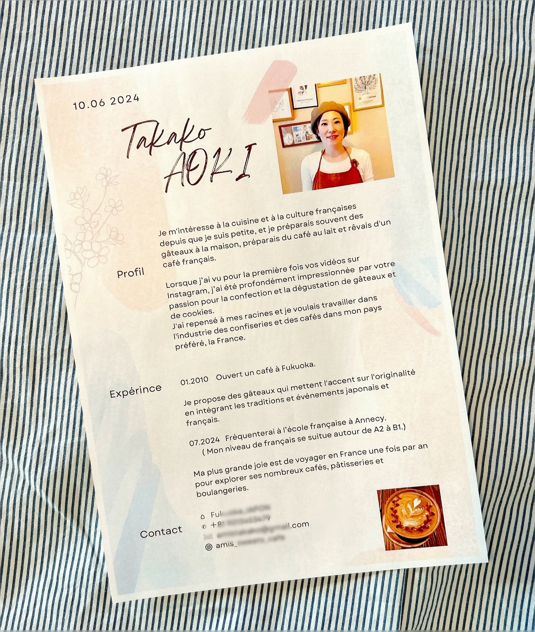 ↑2024.6月 初めて書いたフランスの履歴書。これまで自分が作ってきたスイーツや、彼が作るクッキーに対する情熱をしたためました