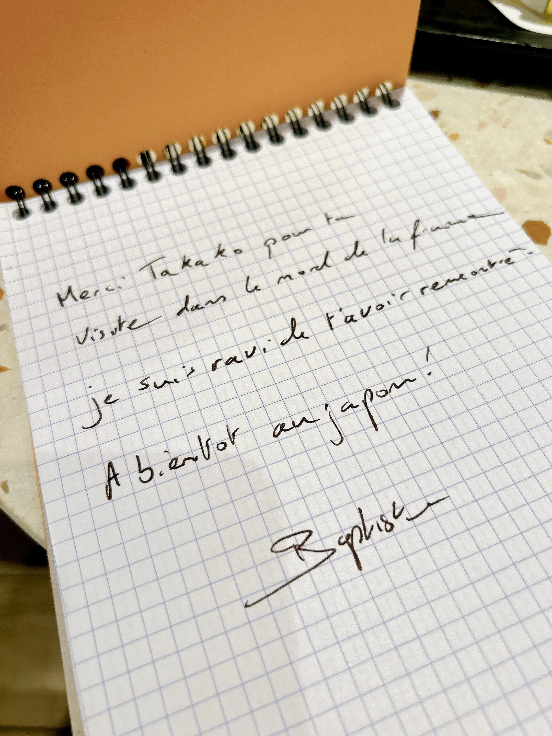 アトリエを訪れた当日はバティストさんとは会えませんでしたが、その履歴書がきっかけで後日連絡をもらい、実際に会う事が出来ました。そこでお話する事が出来、今度一緒にイベントをしましょうと言ってもらいました。