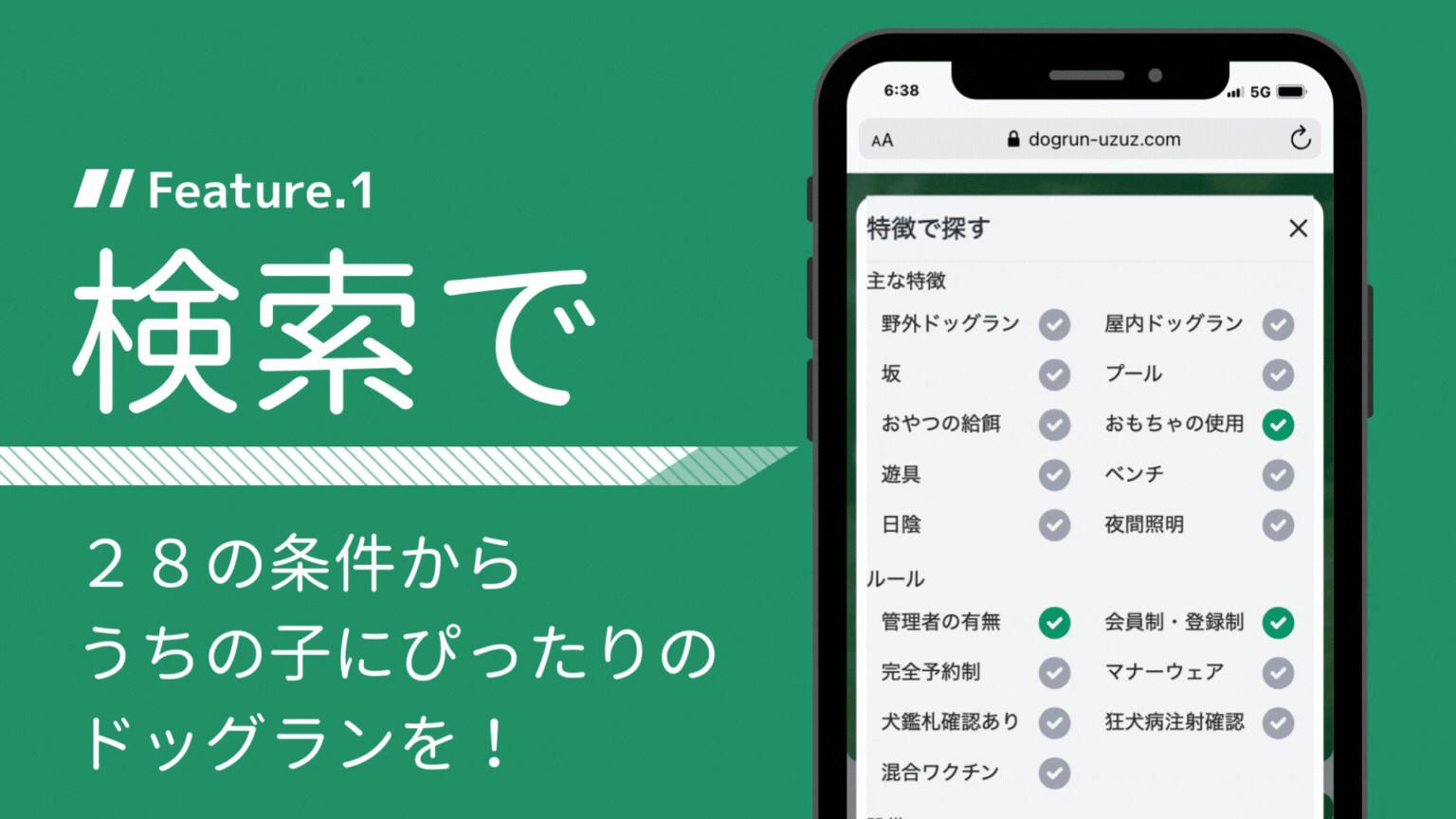 「ワクチンチェック必須のドッグランがいい!」「真夏でも日陰がある場所を探したい!」——そんな希望に応える検索機能を搭載!