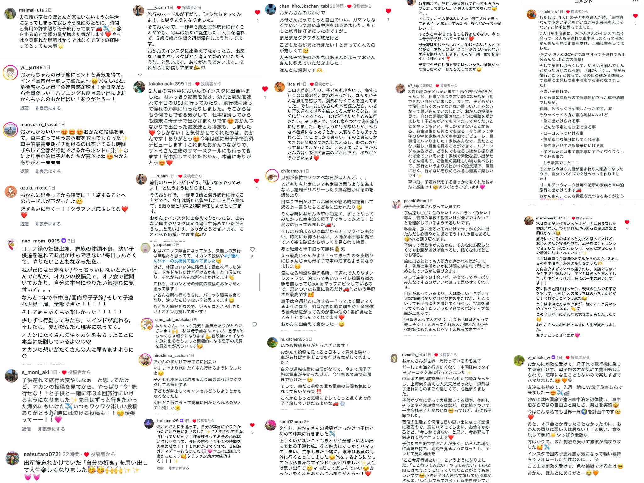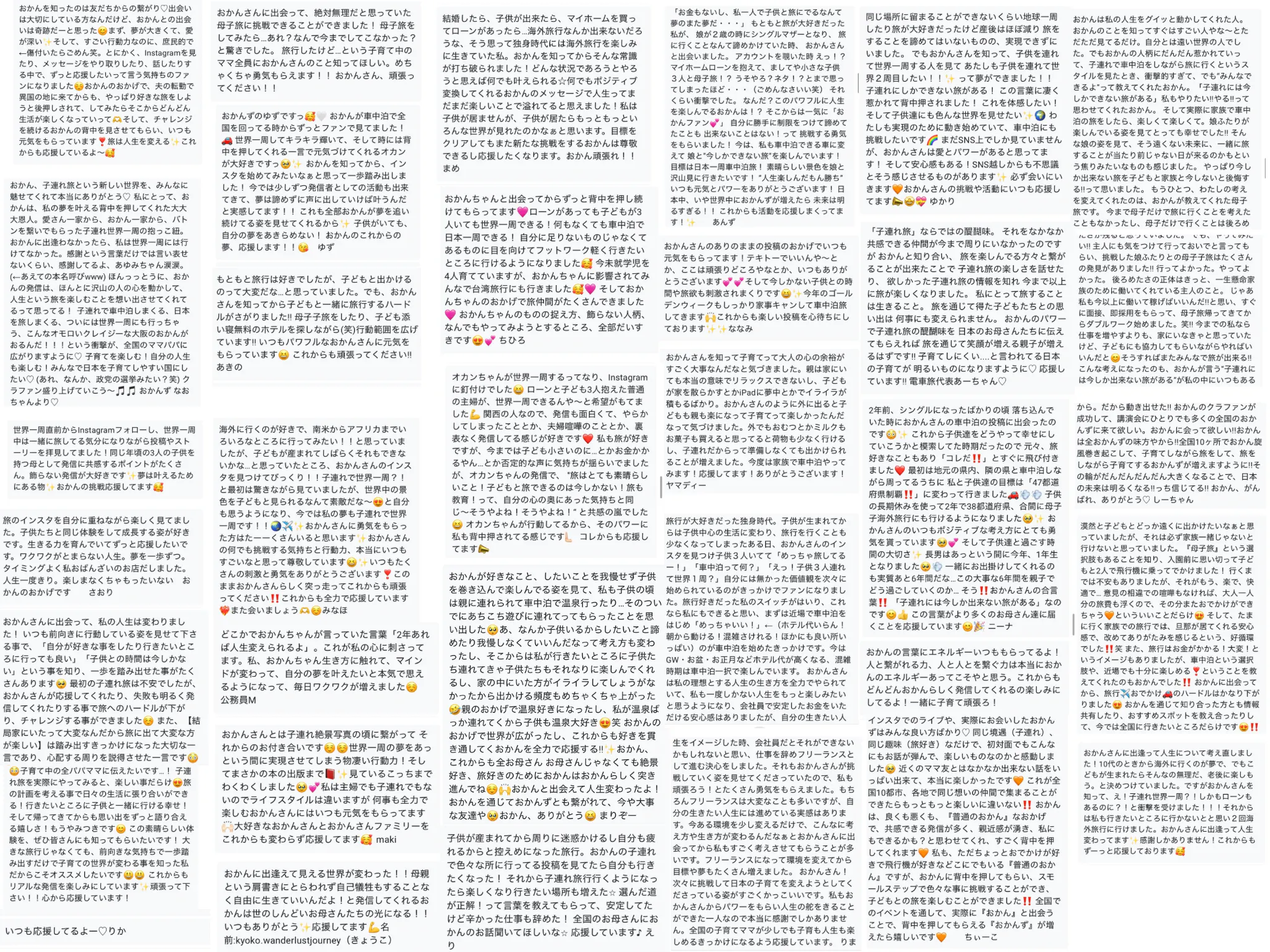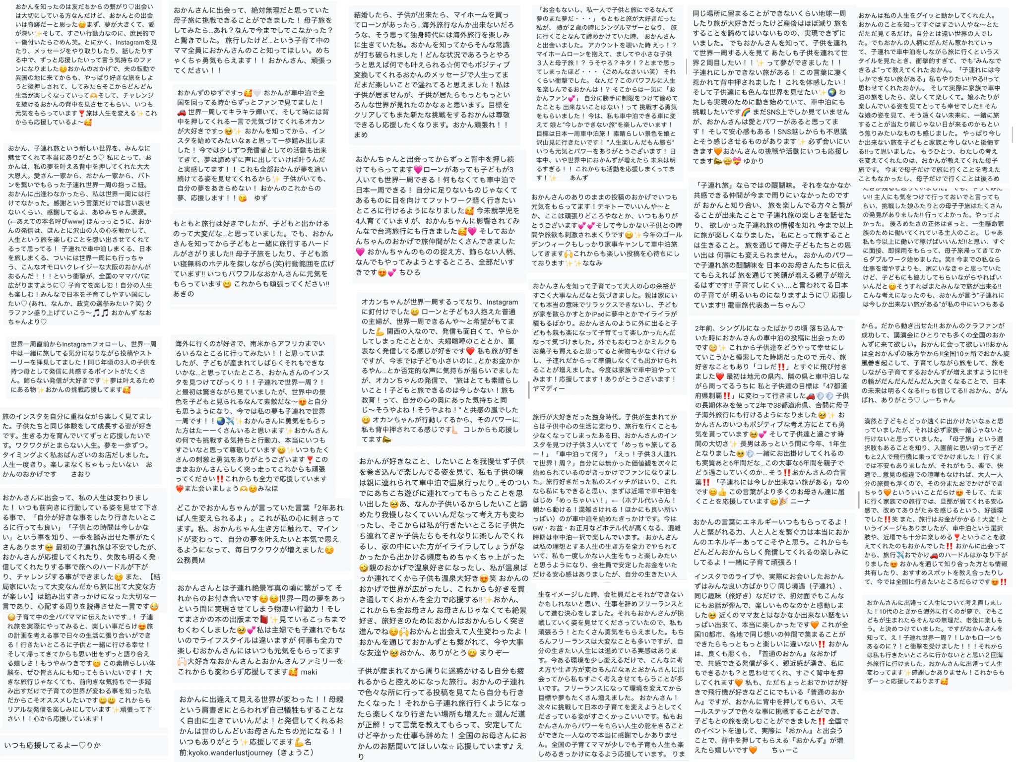 私の元には、実際に「子育てがしんどかったけど、旅をしてみたら本当に楽しくなった!」「人生が変わった!」という声や「私もやってみます!」という宣言もたくさん届きます。