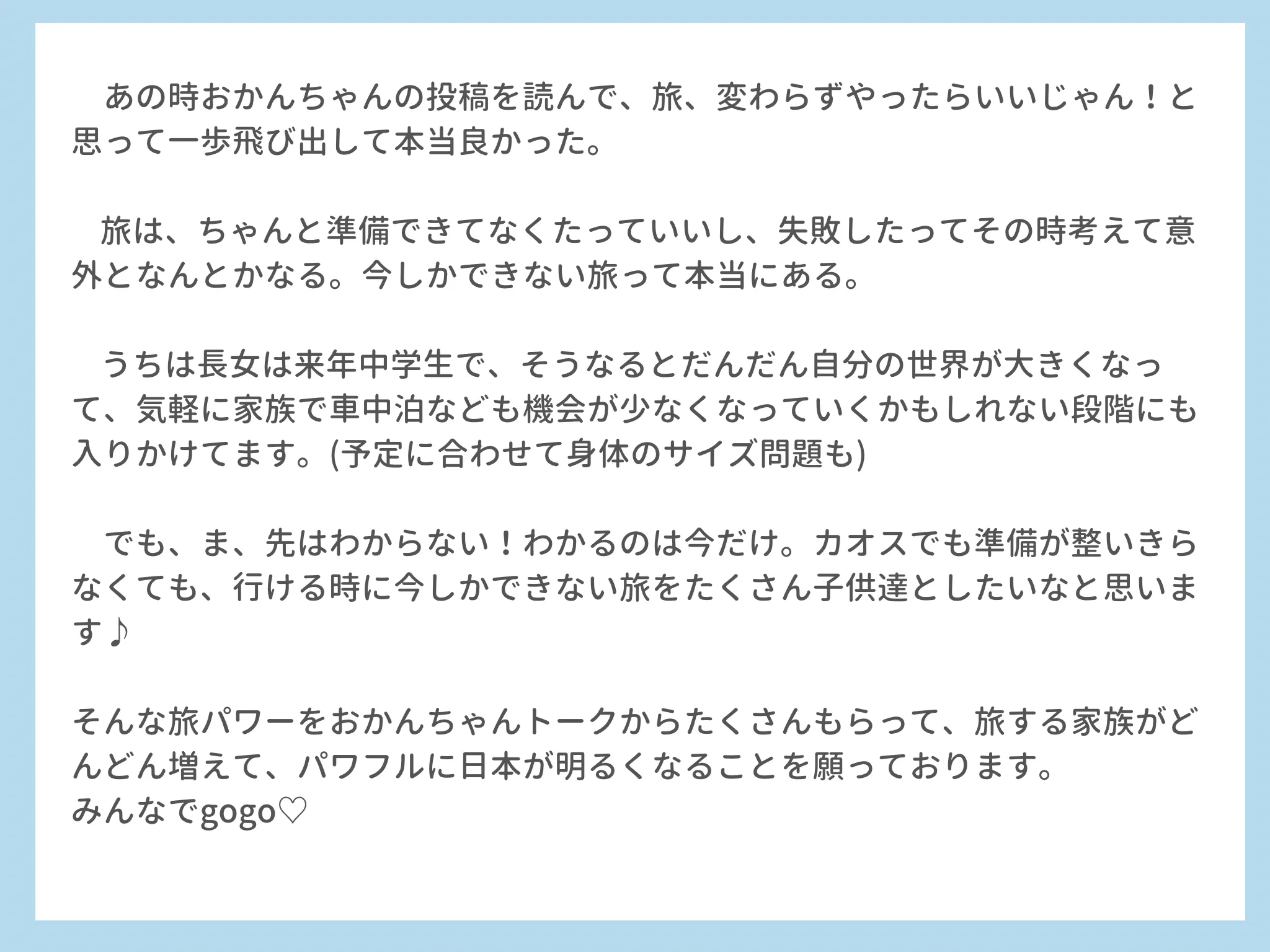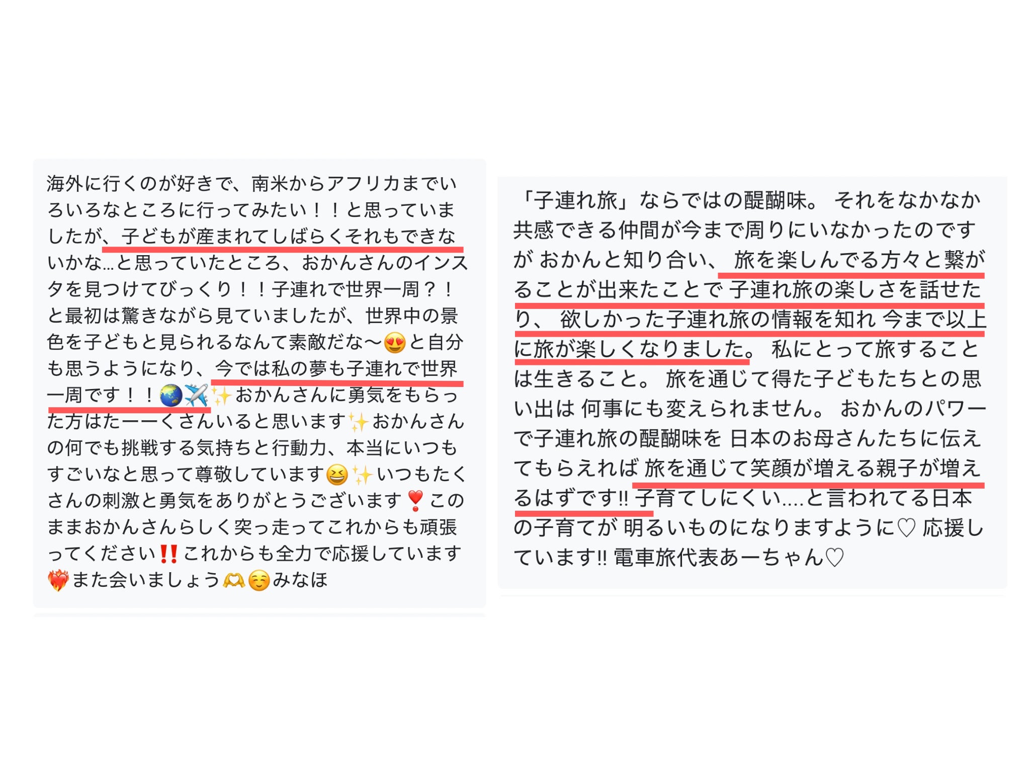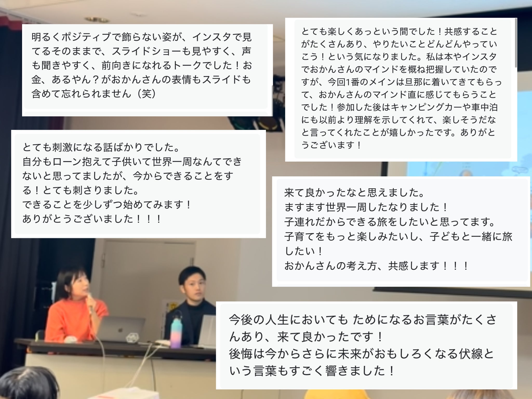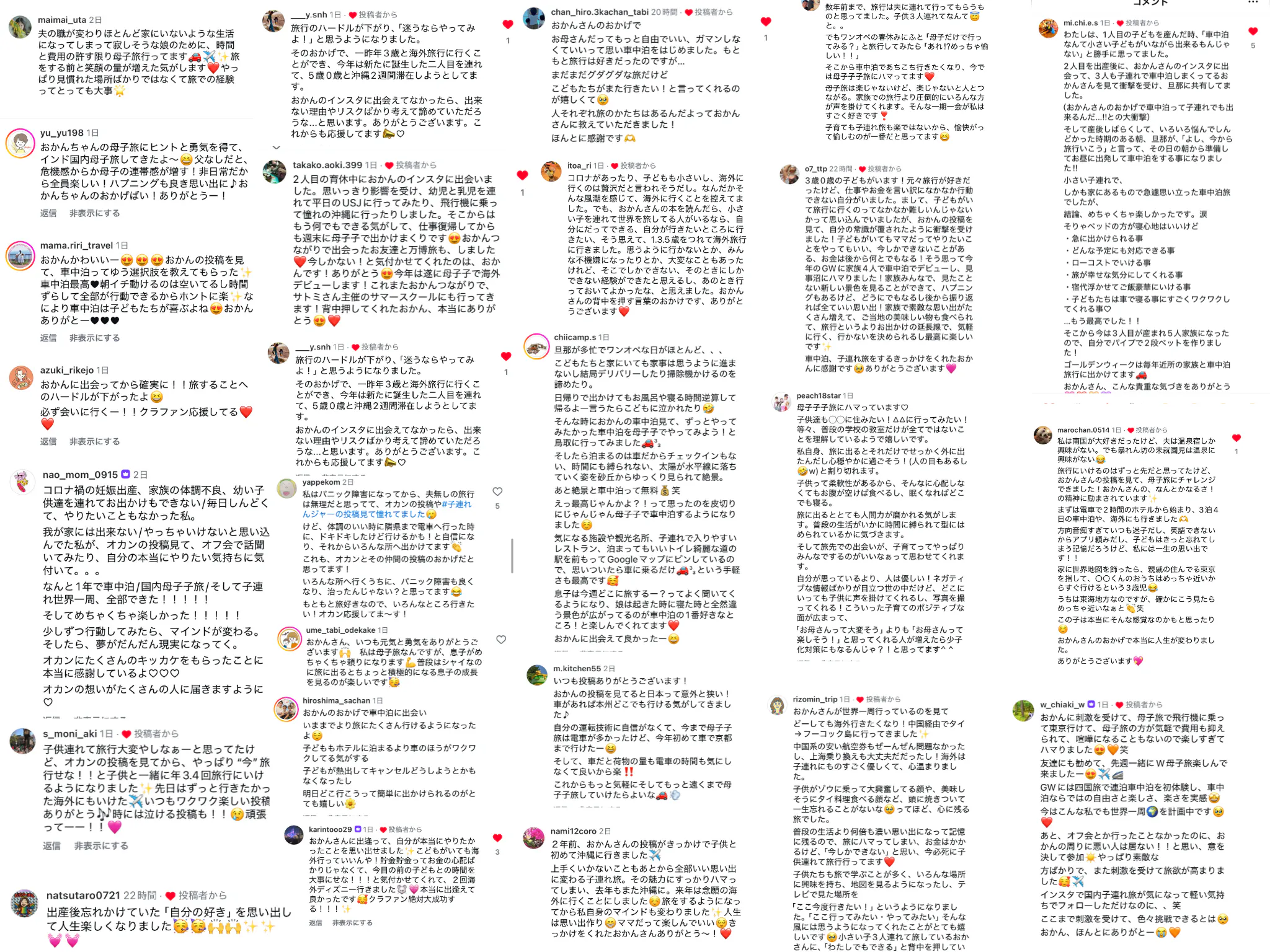 私の元には、実際に「子育てがしんどかったけど、旅をしてみたら本当に楽しくなった!」「人生が変わった!」という声や「私もやってみます!」という宣言もたくさん届きます。