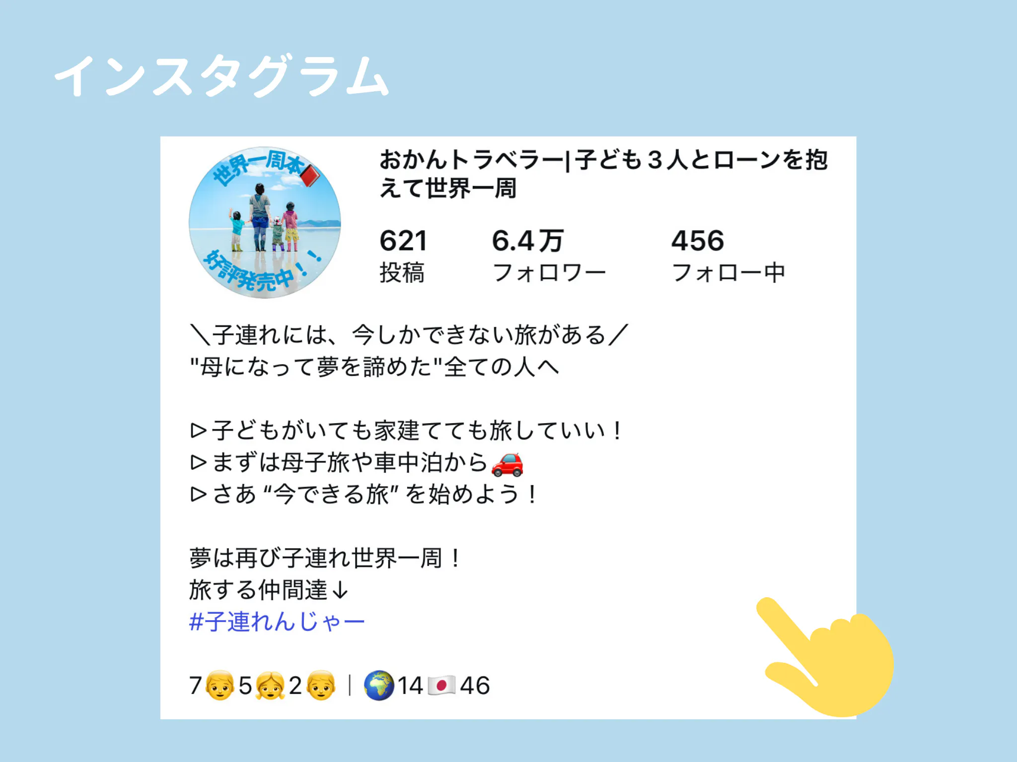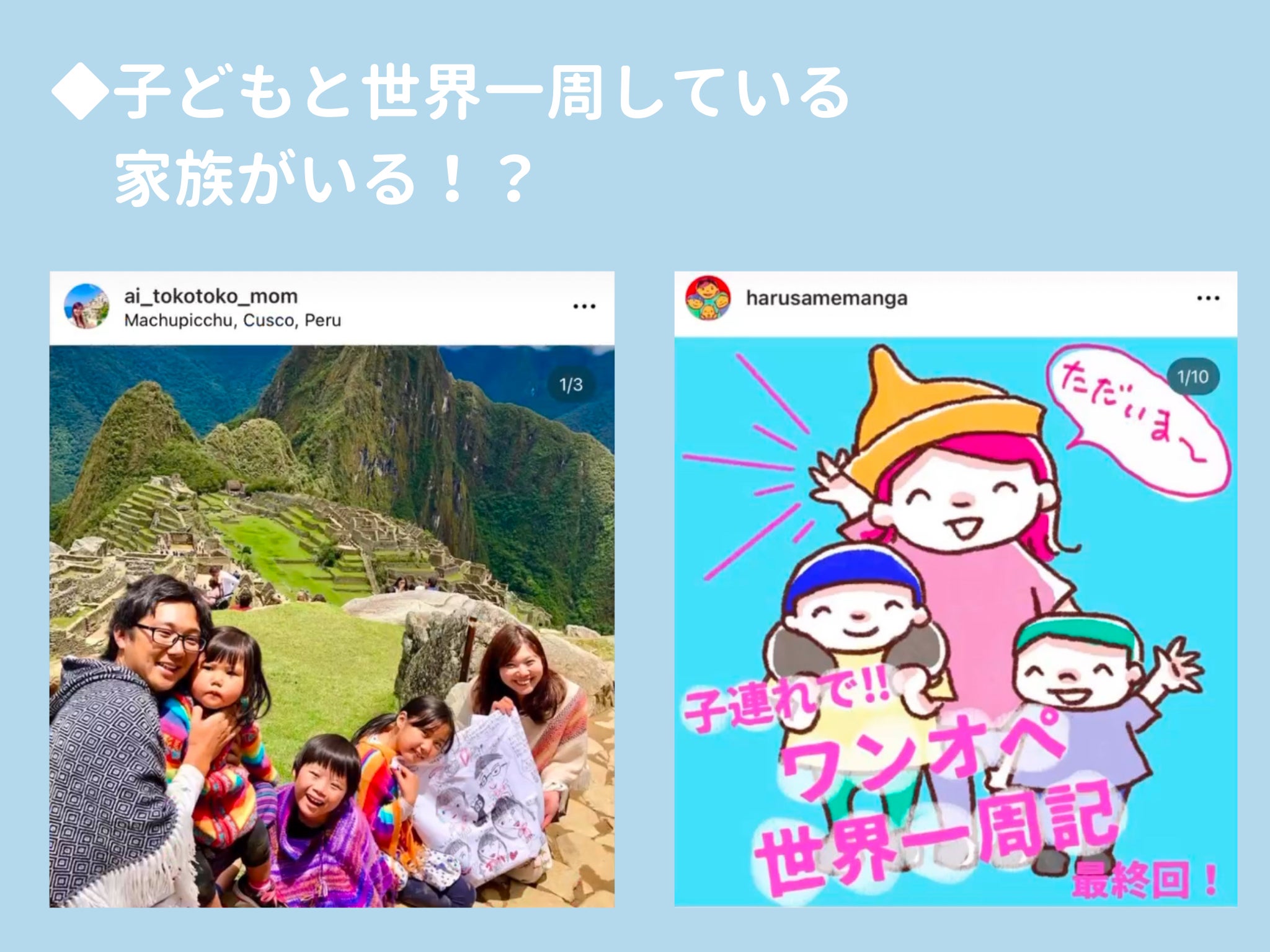 子どもを連れて世界を一周しているご家族をインスタで見つけたのです・・・!しかもローンを払いながら旅をしている!?