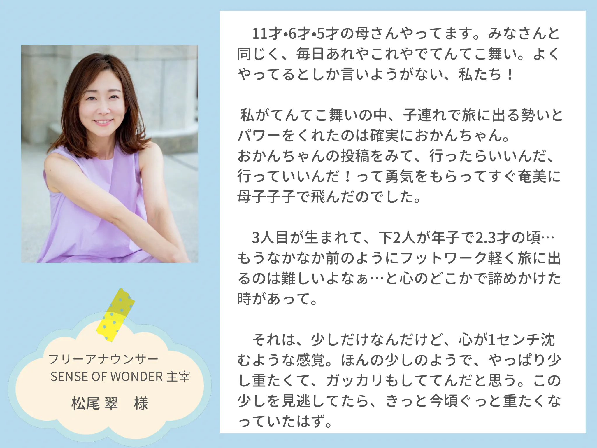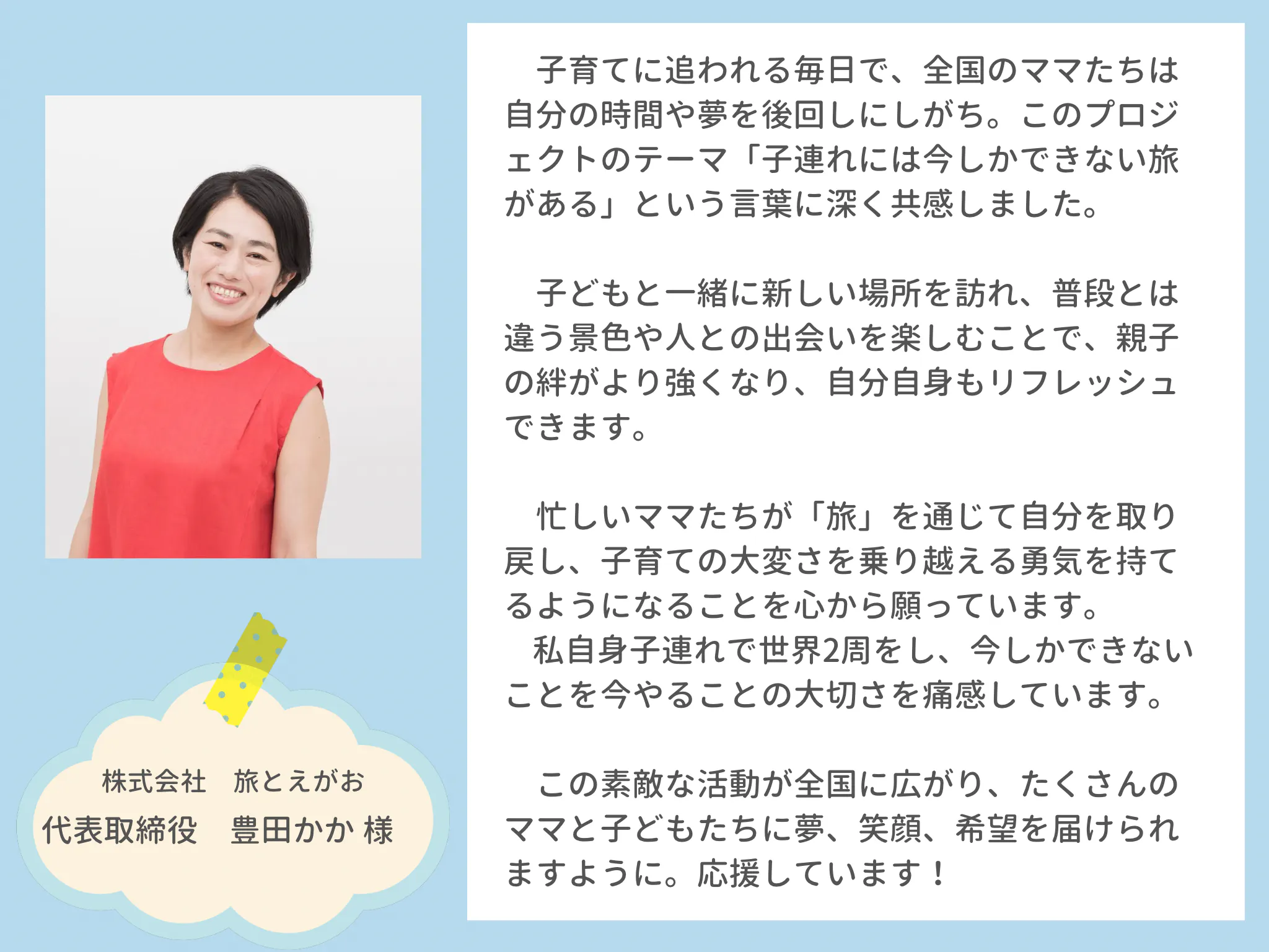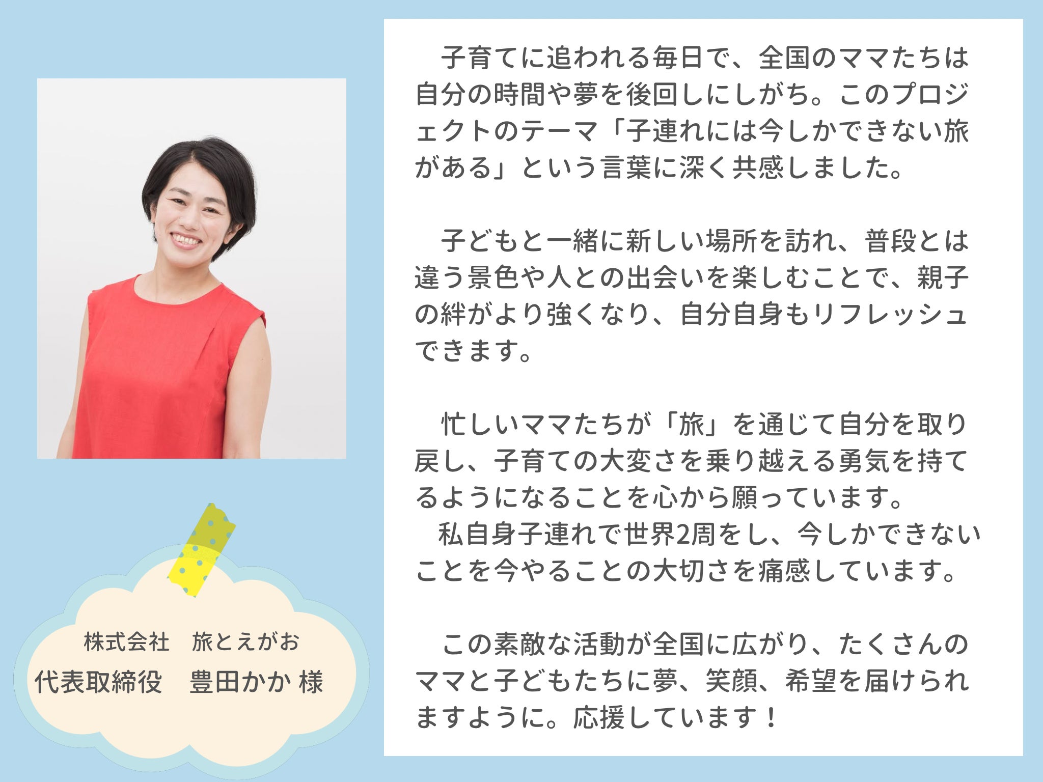 全国のお母さんたちが、旅や「やってみたいこと」に一歩踏み出せるように。そして、今この瞬間の子育てを思いっきり楽しめるように。