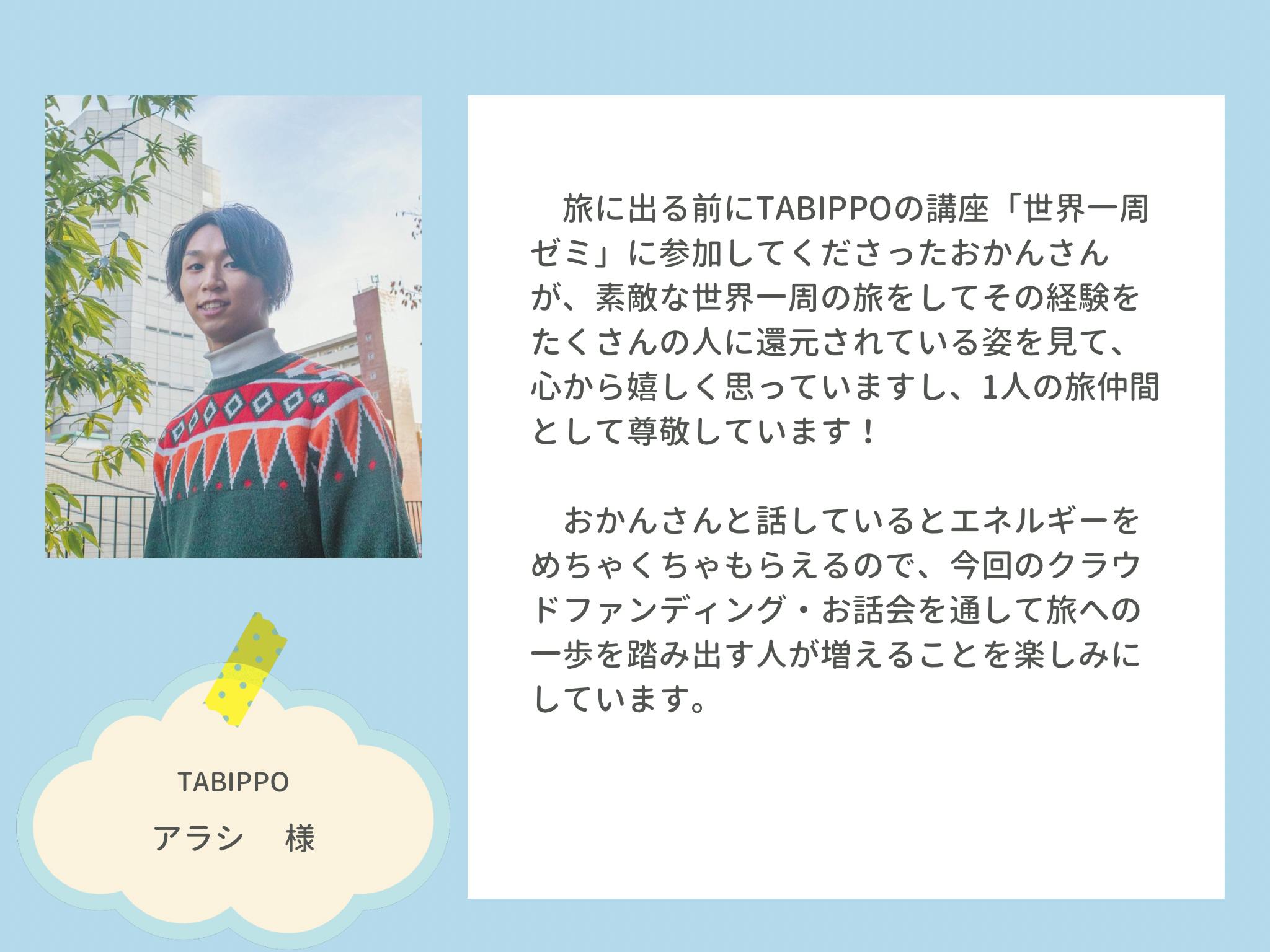 2025/06/07 12:35こんにちは!!おかんトラベラーです!クラファンスタートして10日が過ぎ、45万円を超えるご支援を賜りました。みなさん本当にありがとうございます!熱い応援メッセージもたくさんいただいているので、活動報告ではいただいたメッセージを紹介しながら私の想いも伝えていけたらいいなと思っております!私は今回お話会という形でお母さん達に伝えていくことを決めました。これ本来、今のままインスタで発信し続けるでも伝わるやん?と思われた方もいるかもしれません。確かにそうなんです。インスタなら何万人もの方に一気に伝えられる。“広くたくさんの人に伝える”という視点では、インスタの方が圧倒的に早いし楽なんです。0円やし。ただ、なぜ私がオフラインでやることを決めたのかというと理由は二つあるので今日はそのうちの一つを紹介します。それは”直接会って話す”ことのパワーを知っているから!それは私と会うだけではなくて、お母さん同士が会うと言うことも。私は何度かオフ会やお話会のイベントを開催しています。みんな口を揃えて「オフで会うっていいですね!」と言ってくれます旅が好き、旅をしたい、してみたいそんなお母さん達がリアルに会うことで「同じ想いを持ったお母さん私だけじゃないんだ!」と思えるようになる。一人なら不安でもみんなとならできそうな気がする。そして知らなかった世界が一気に開けてワクワクが止まらなくなるのです!ワクワクしてるお母さんって素敵だなと思っています。身近に子連れで車中泊してる人いますか?マイル使って旅してる人いますか?世界一周してる人いますか?笑いない方こそぜひ来てください!周りにいないだけで実はたくさんおられるのです!いただいたメッセージのように、子連れじゃ無理と思っていた方が私もいけるかも!できることからやってみよう!と思ってもらえる場所であることは保証します!各お話会への参加は、各都市の参加権か、日めくりカレンダー付きの参加権のご支援でご参加いただけます。みなさんにお会いできることを楽しみにしています。 もっと見る