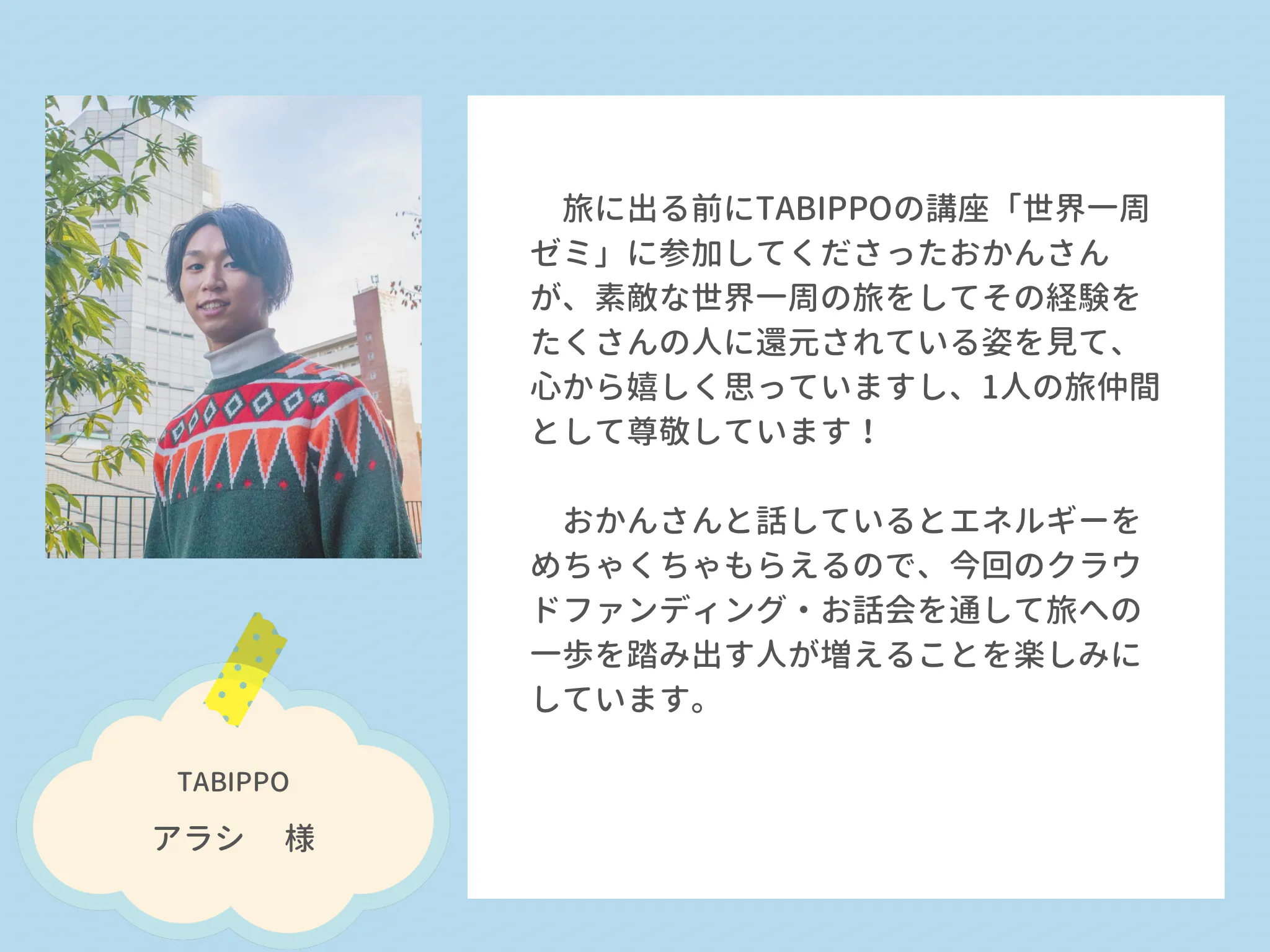 知識や経験は旅人の方には遠く及びませんが、こんな私だからこそできることがあると思って発信活動を続けています。