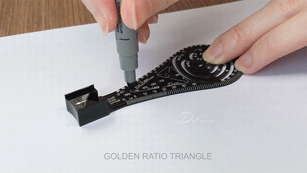 描画したい形に沿った定規を取り付けてマーキングし、それを繋ぐことで誰でもかんたんに黄金比の正確な多角形が作画できます。