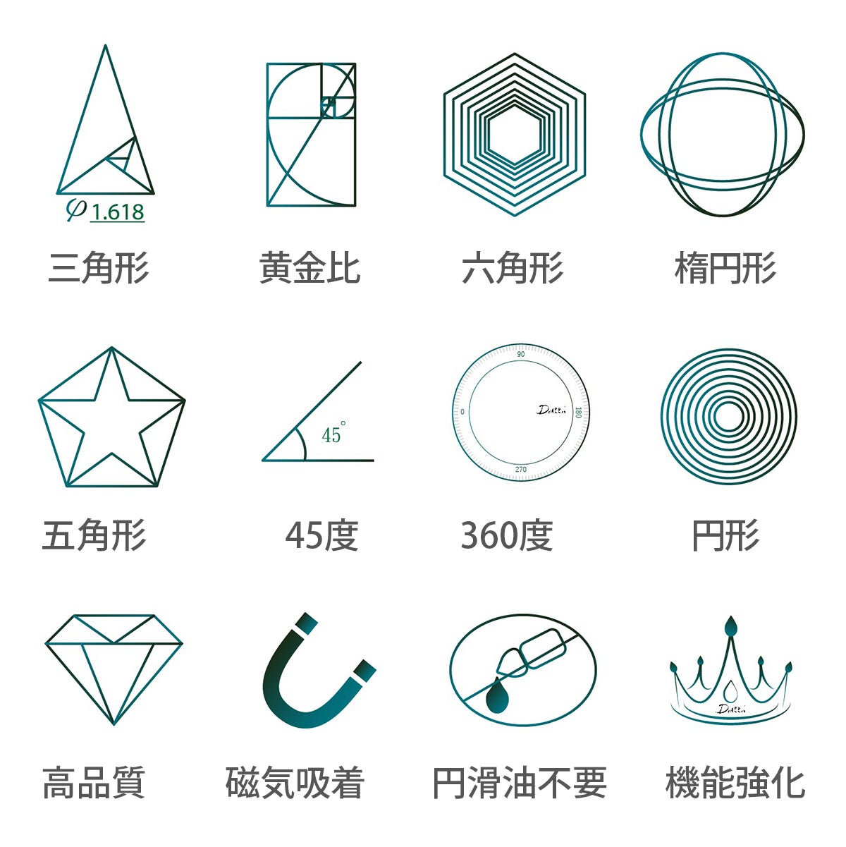 異なる定規を組み合わせることで、縦横含め50種類以上のさまざまな楕円が作成可能です。